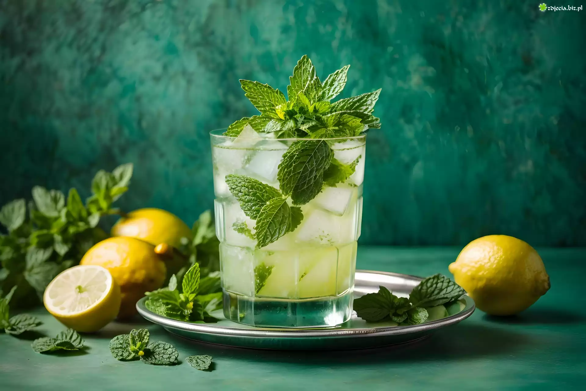 Zdjęcie Koktajl alkoholowy, Mojito, Szklanka, Mięta, Kostki, Lodu, Taca, Cytryny, Zielone, Tło Alkohole |
