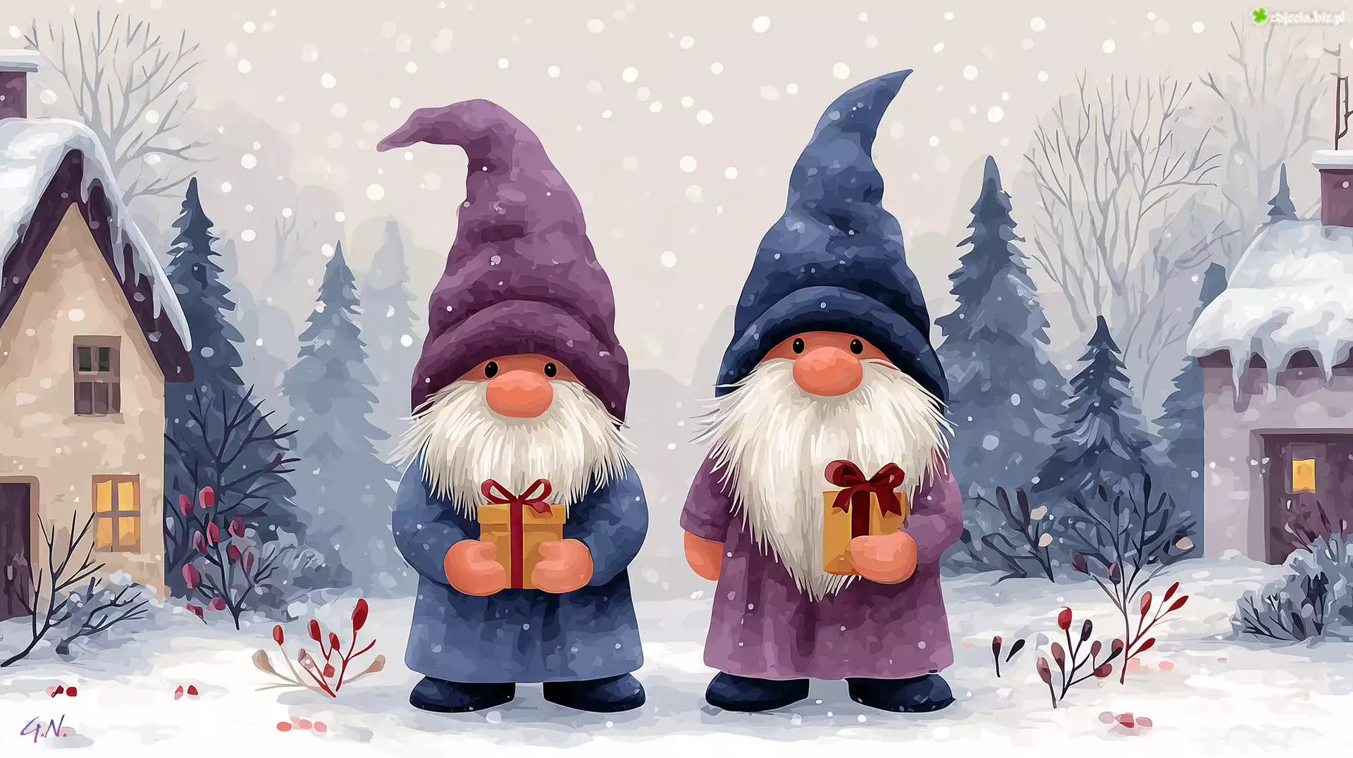 Zdjęcie Dwa, Skrzaty, Prezenty, Zima, Grafika AI