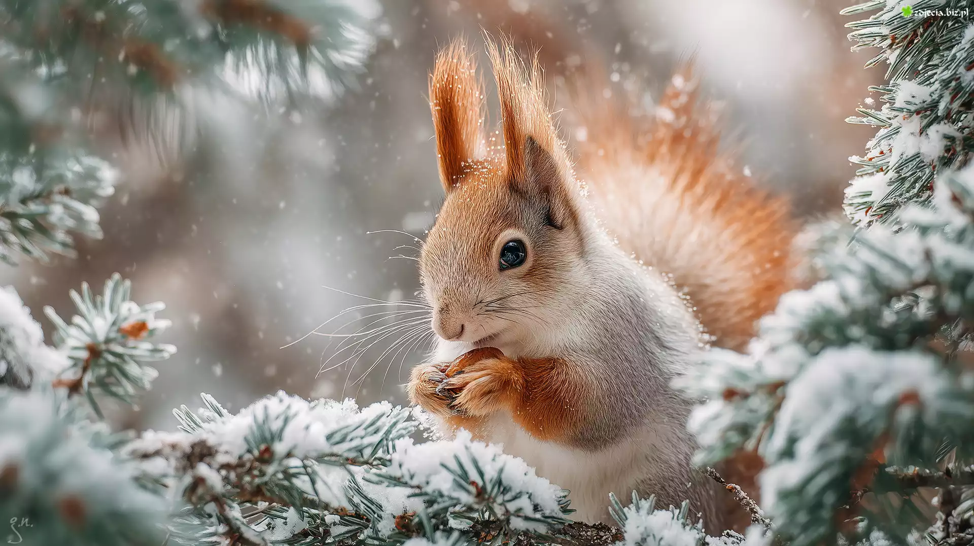 Zdjęcie, Wiewiórka, Gałązki, Śnieg, Zima, Grafika AI