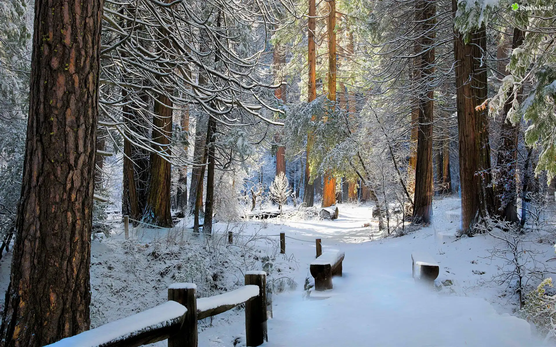 Zdjęcie Zima, Las, Drzewa, Ławki, Drzewa