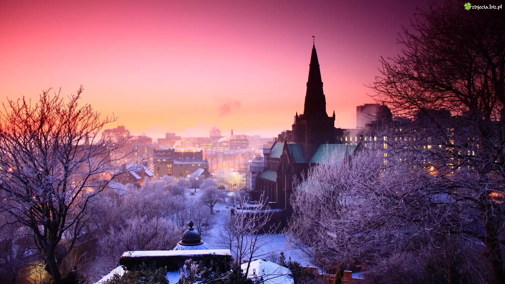 Zdjęcie Kościół, Zima, Wielka Brytania, Szkocja, Glasgow, Drzewa, Budynki