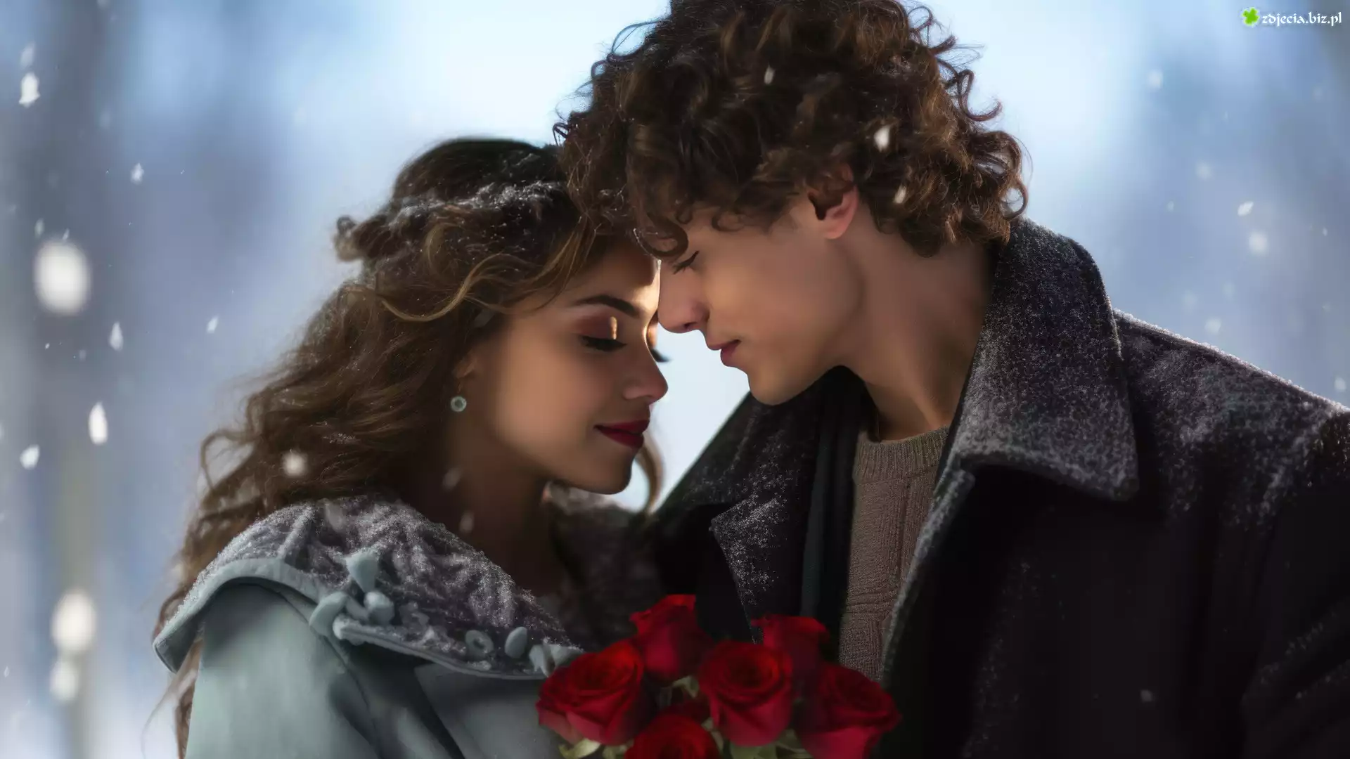 Zdjęcie Zima, Kobieta, Mężczyzna, Para, Zakochani, Śnieg, Czerwone, Róże, Bukiet, Grafika