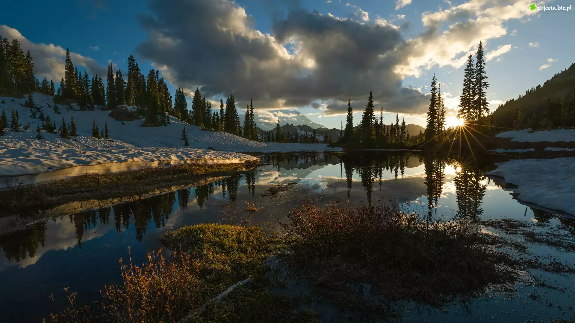 Zdjęcie Zima, Las, Jezioro, Góry, Śnieg, Drzewa, Chmury, Wschód słońca