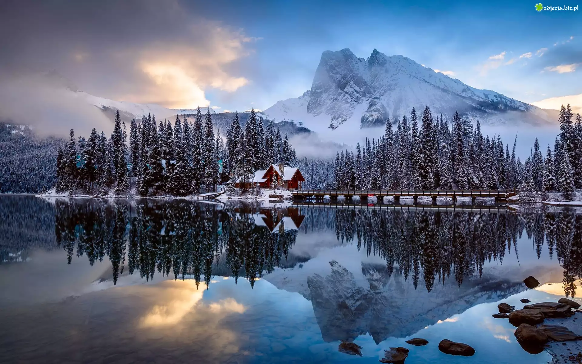 Zdjęcie Zima, Góry, Drzewa, Dom, Most