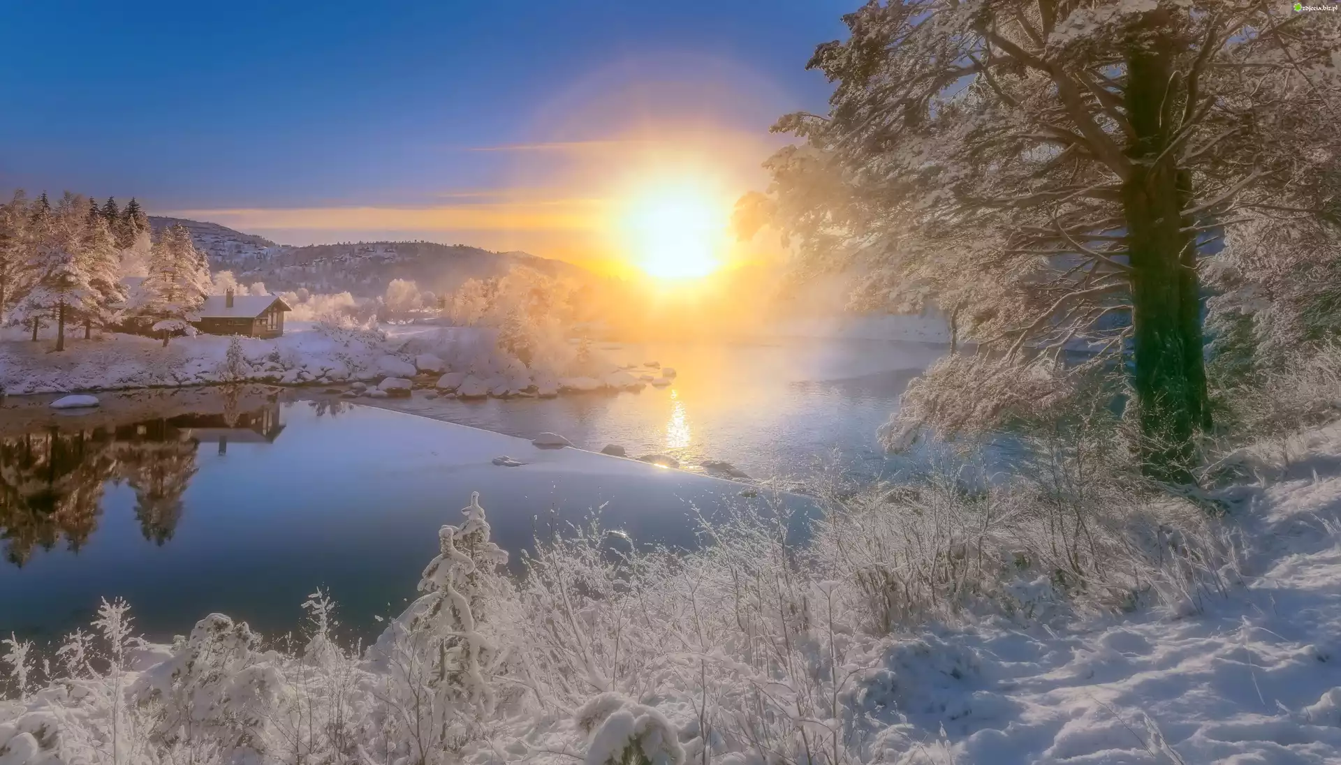 Zdjęcie, Zima, Rzeka, Drzewa, Dom, Świt