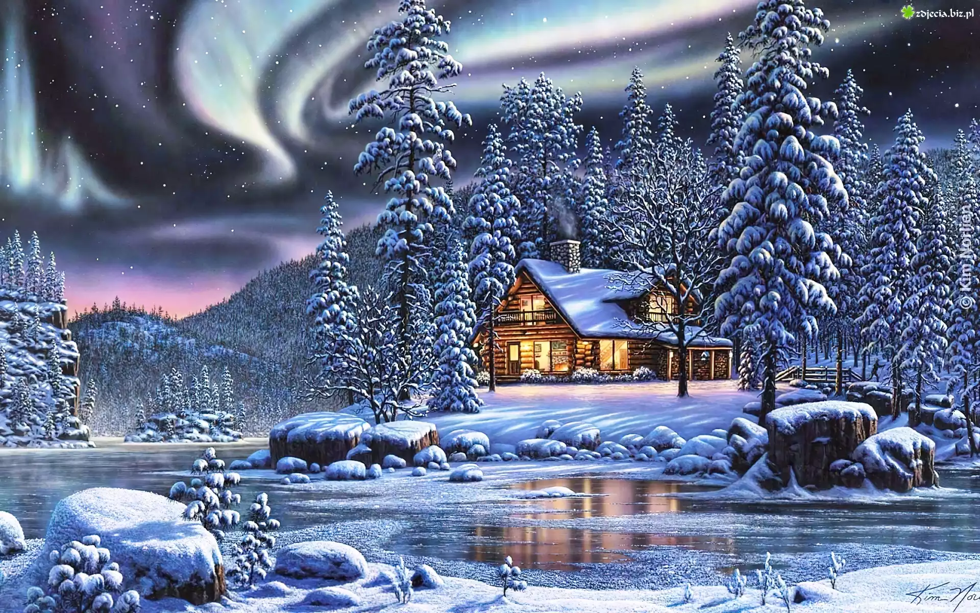 Zdjęcie, Zima, Las, Dom, Rzeka