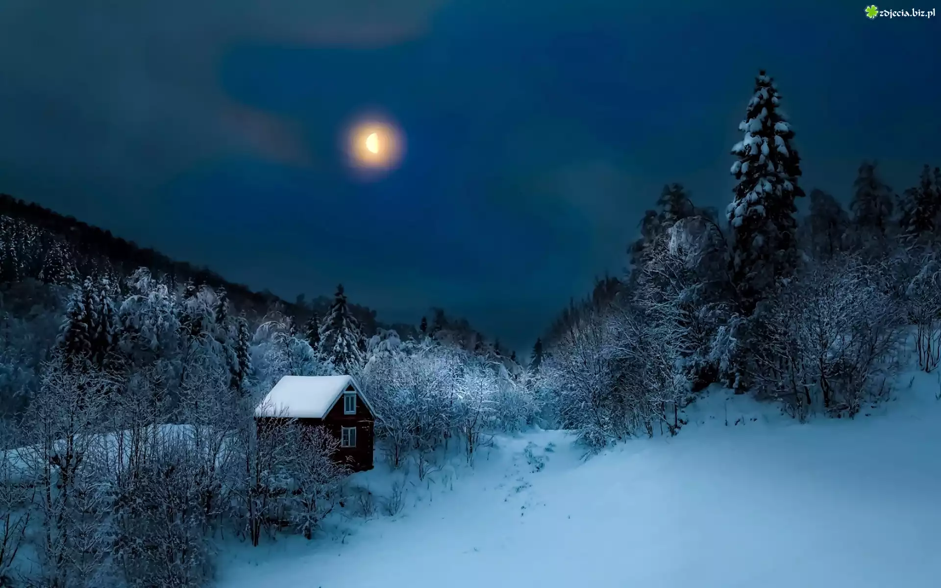 Zdjęcie Zima, Las, Domek, Księżyc