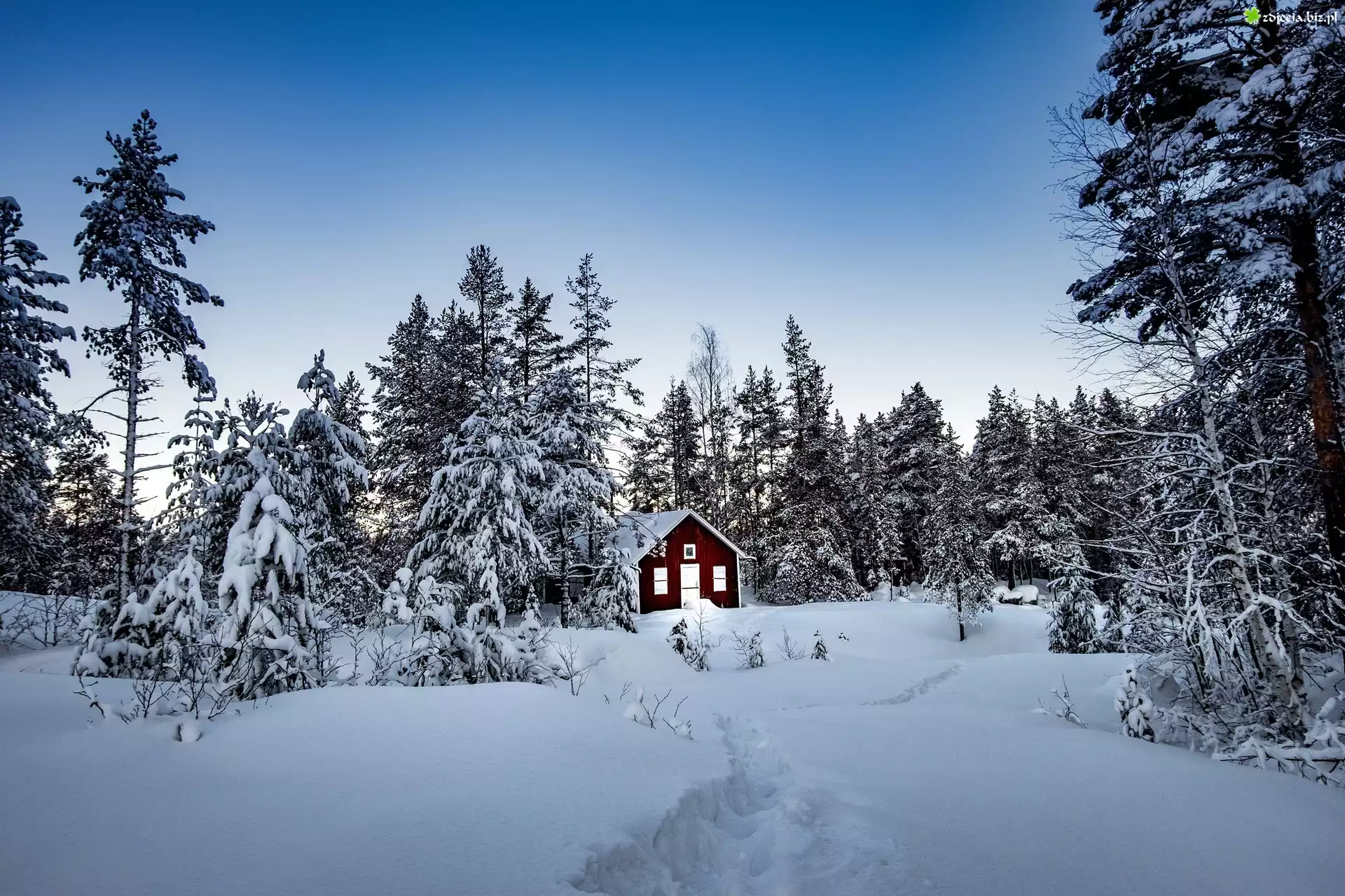 Zdjęcie, Zima, Ośnieżone, Świerki, Drewniany, Domek, Ścieżka