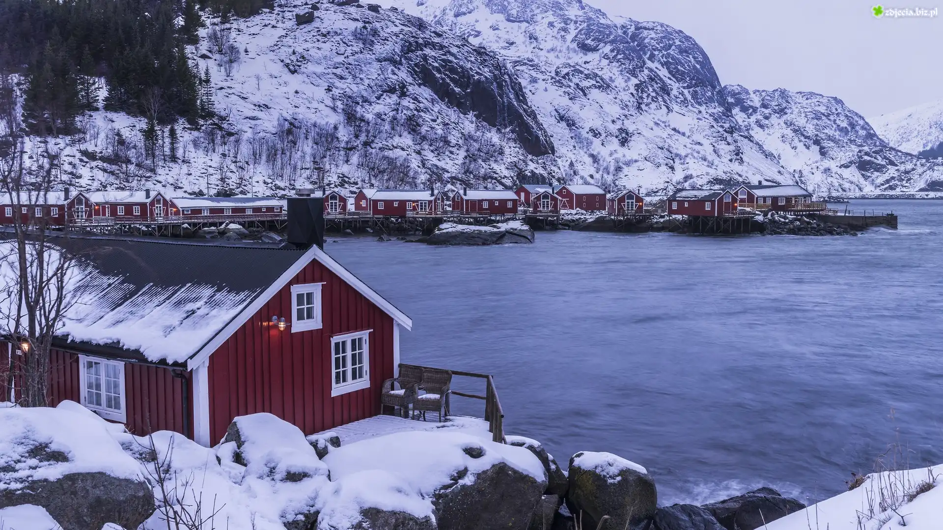 Zdjęcie Zima, Góry, Morze, Domy, Kamienie