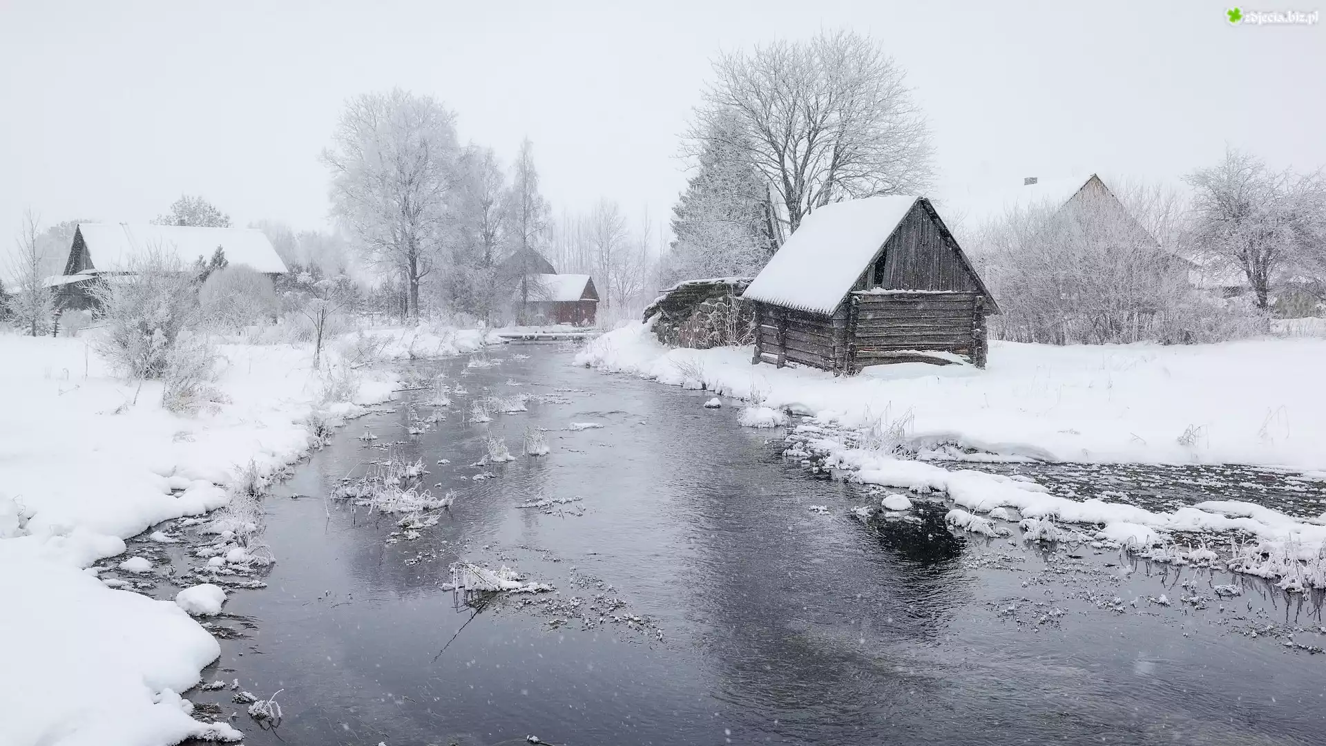 Zdjęcie Domy, Drzewa, Rzeka, Zima