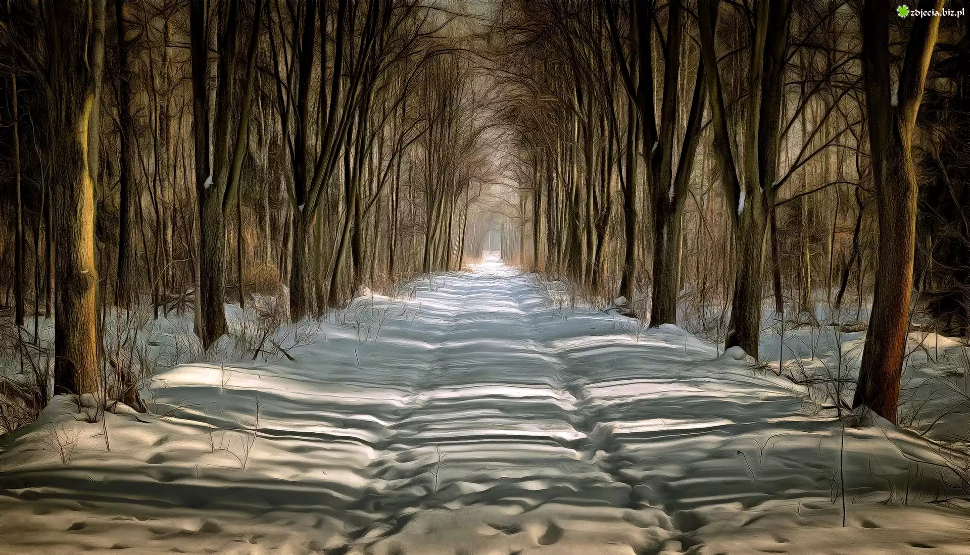 Zdjęcie Zima, Las, Drzewa, Droga, Grafika