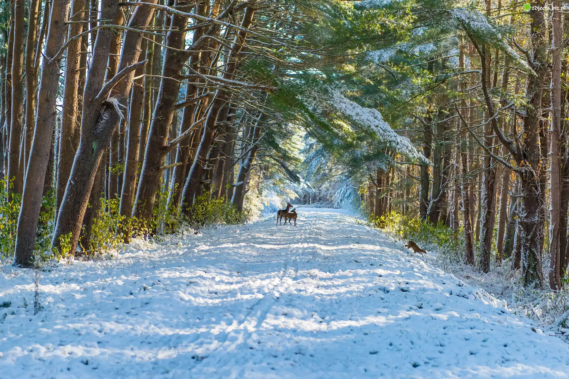 Zdjęcie Zima, Las, Drzewa, Śnieg, Droga, Sarny