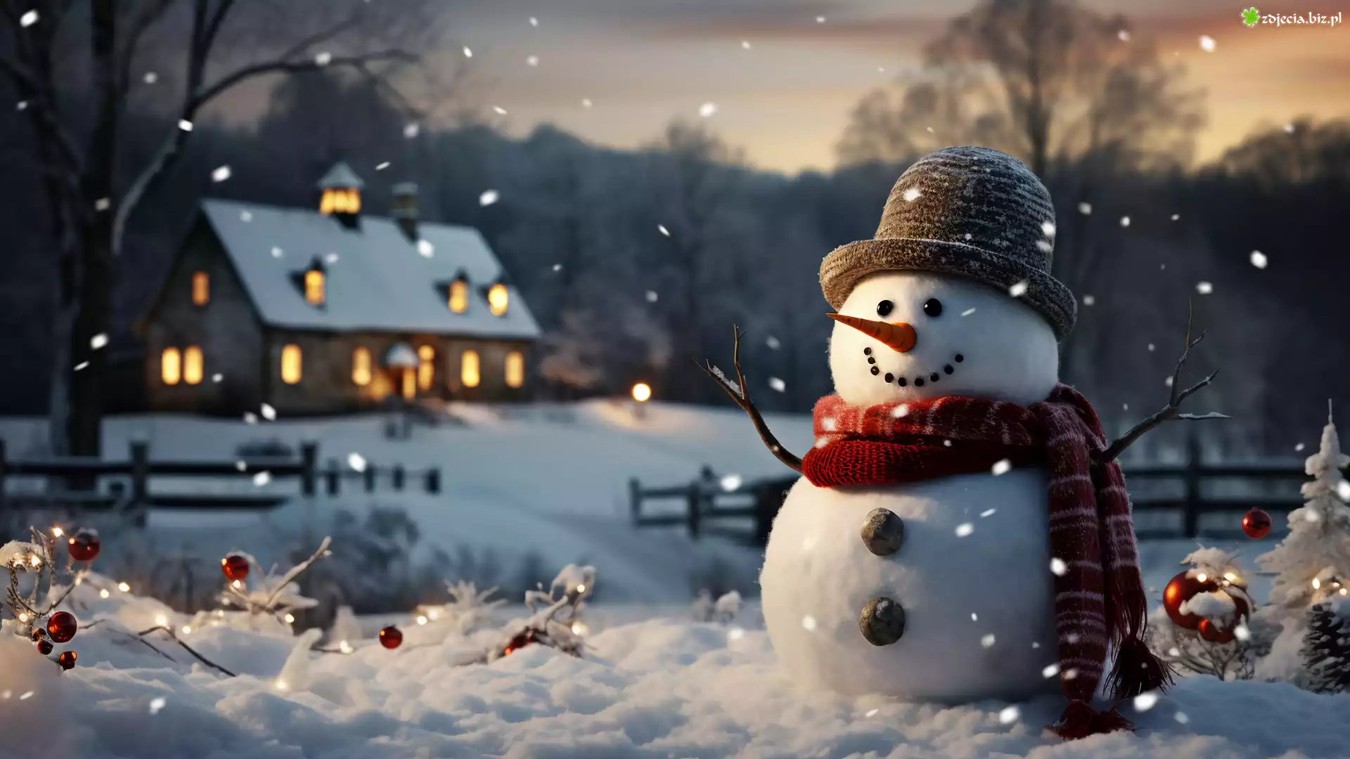 Zdjęcie Zima, Śnieg, Bałwan, Szalik, Kapelusz, Bombki, Oświetlony, Dom, Drzewa, Grafika