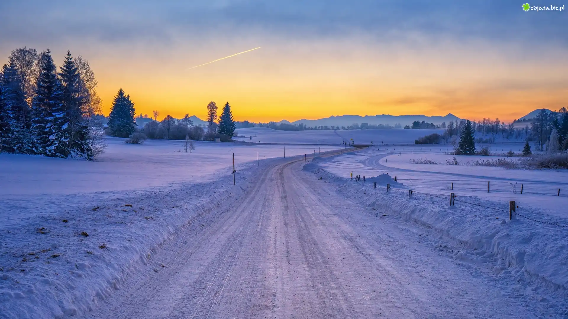 Zdjęcie Zima, Odśnieżona, Droga, Drzewa, Góry
