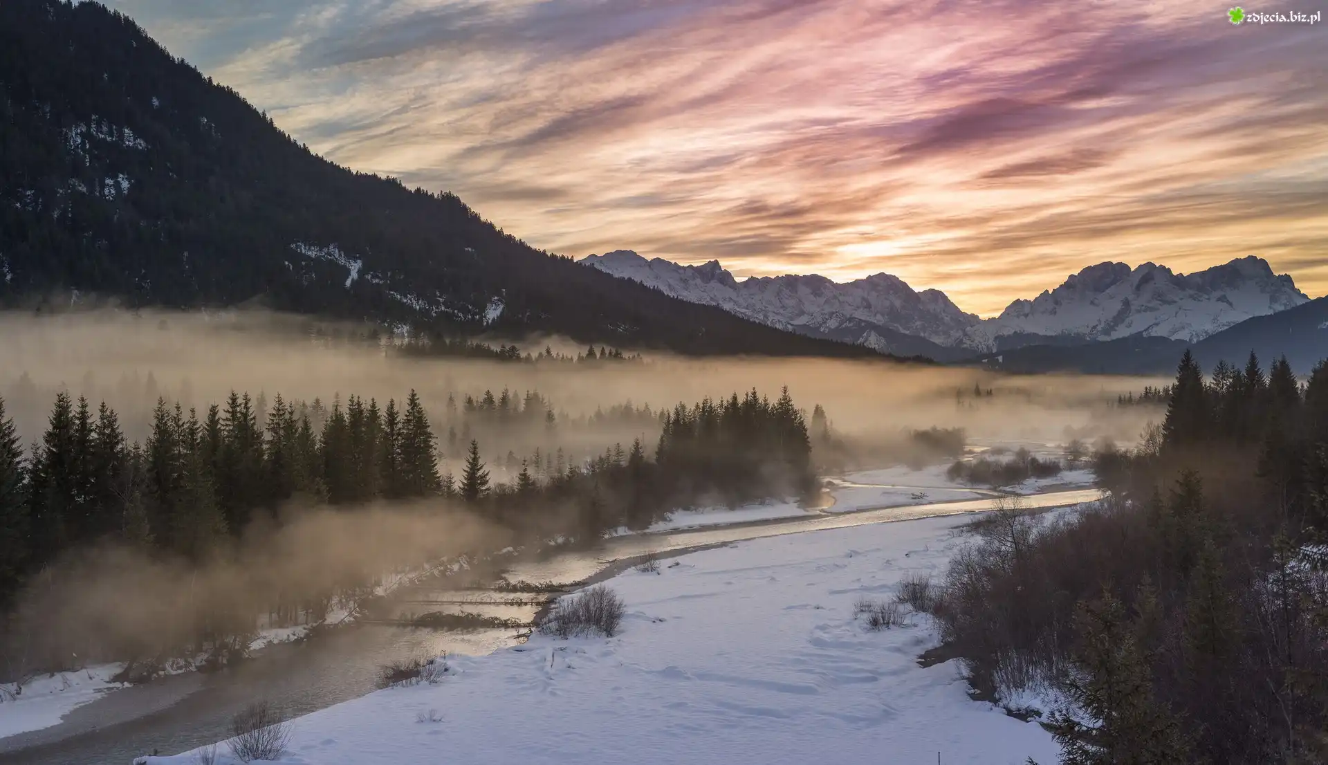 Zdjęcie Zima, Rzeka, Góry, Drzewa, Mgła