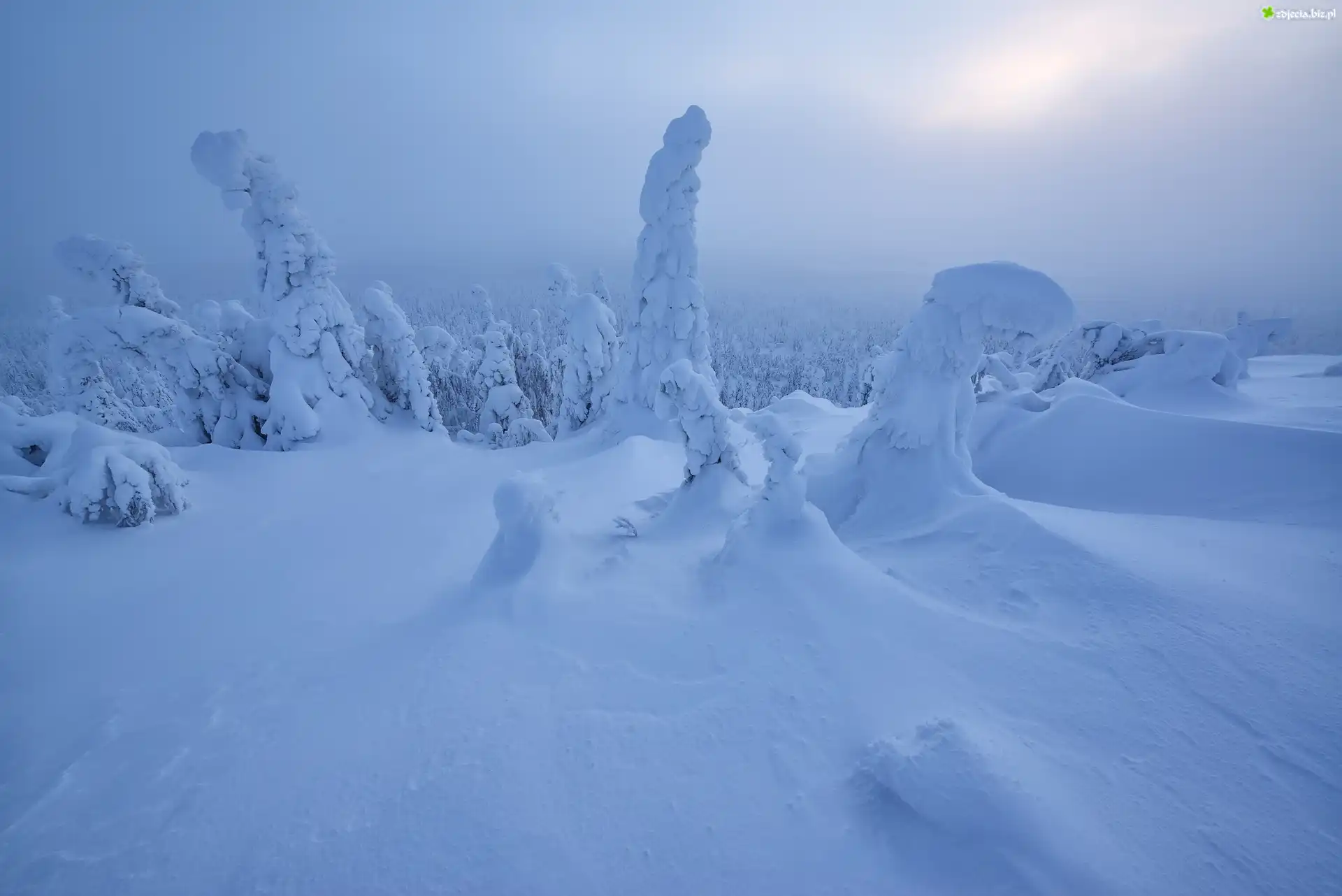 Zdjęcie, Zima, Finlandia, Laponia, Ośnieżone, Drzewa, Słońce