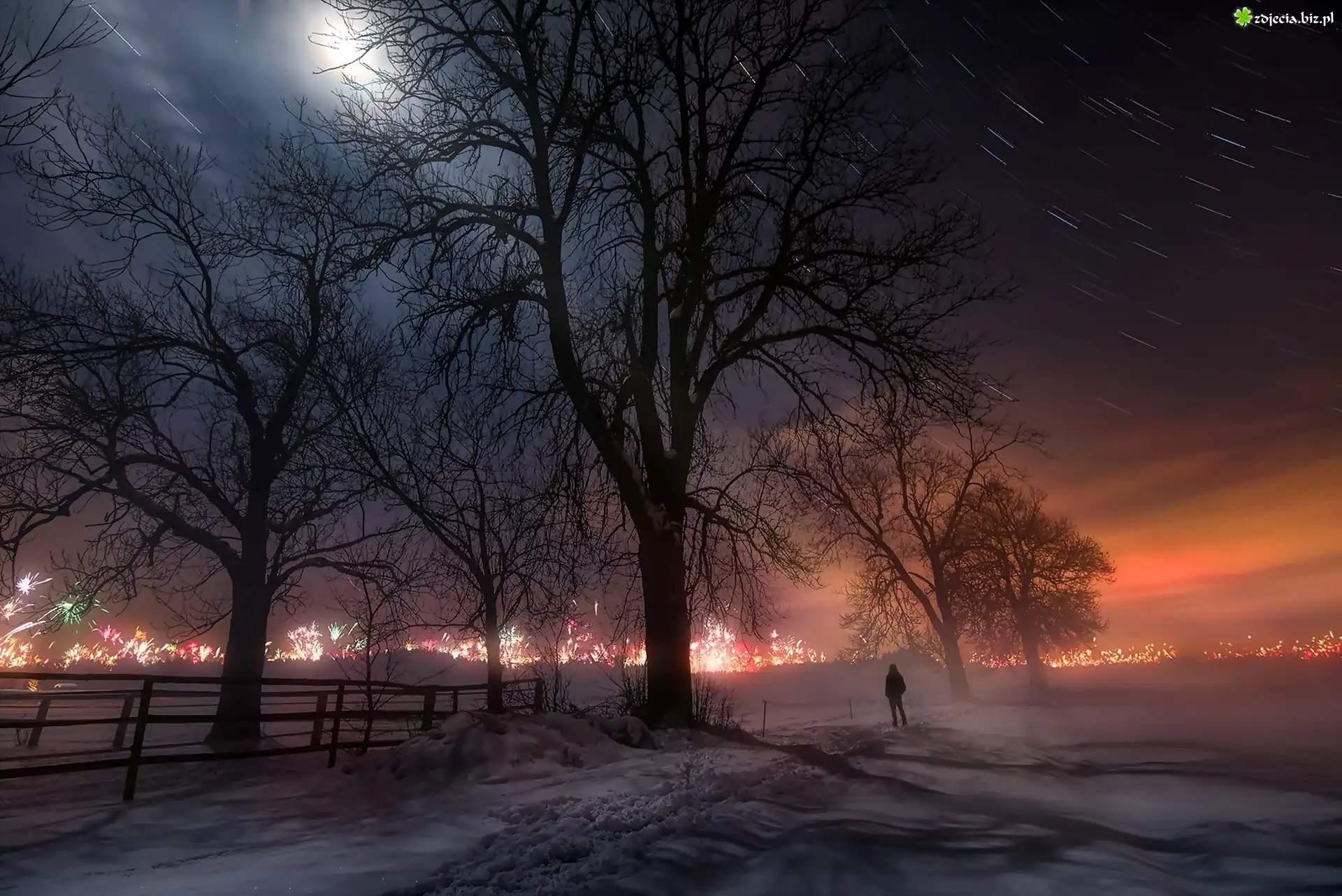 Zdjęcie, Zima, Noc, Mgła, Drzewa, Fajerwerki