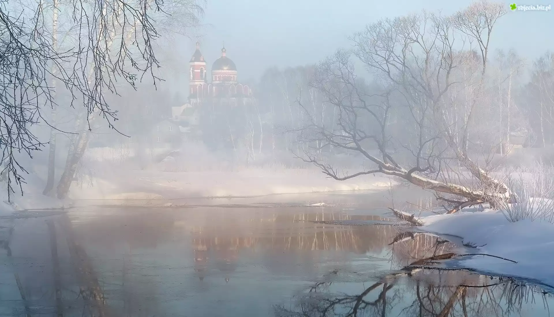 Zdjęcie Zima, Śnieg, Mgła, Rzeka, Drzewa, Cerkiew