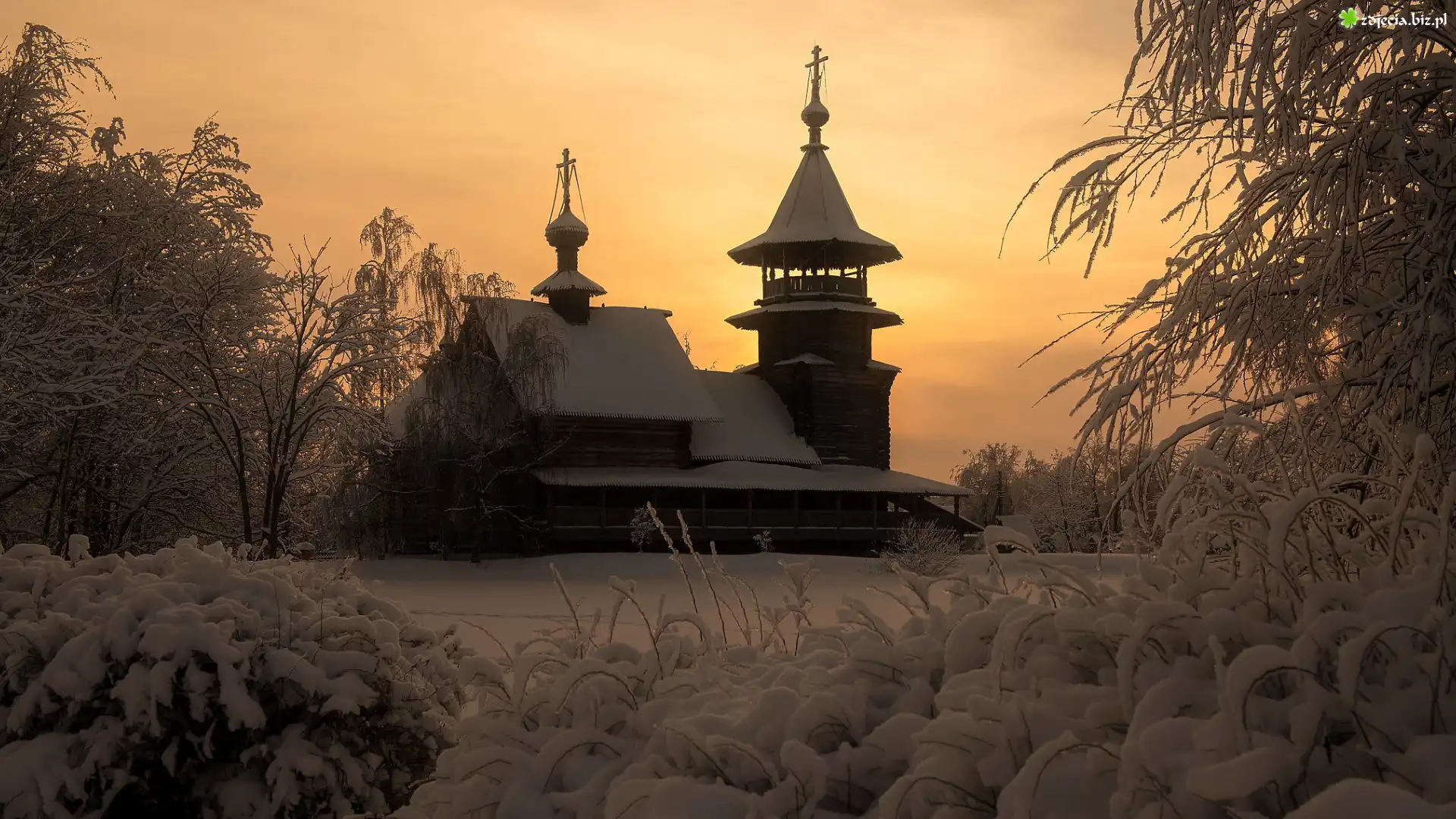 Zdjęcie Zima, Cerkiew, Ośnieżone, Gałęzie, Drzewa, Krzewy