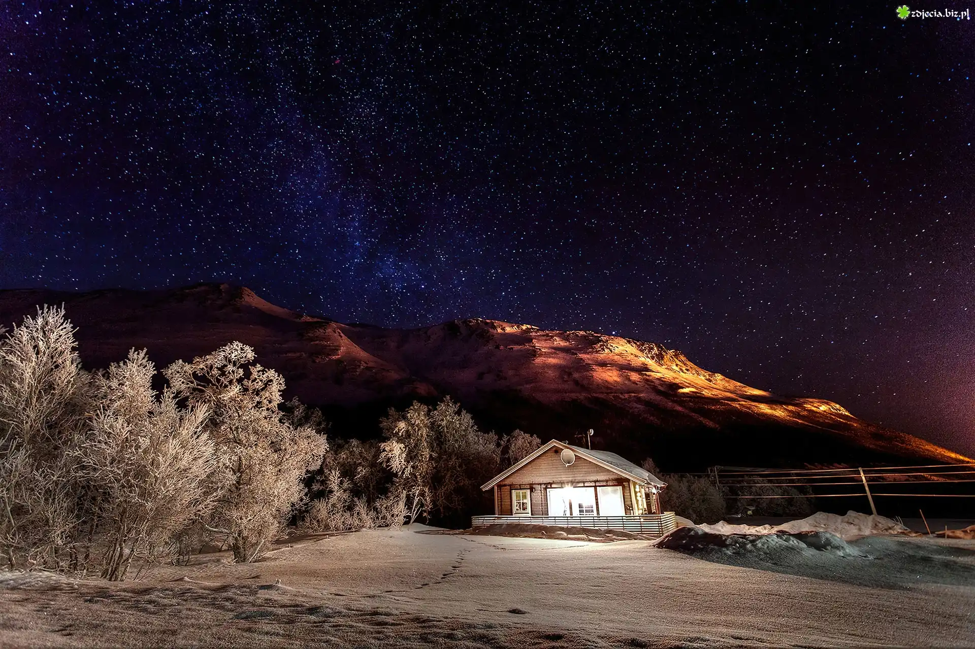 Zdjęcie Zima, Góry, Oświetlony, Dom, Drzewa, Gwiazdy
