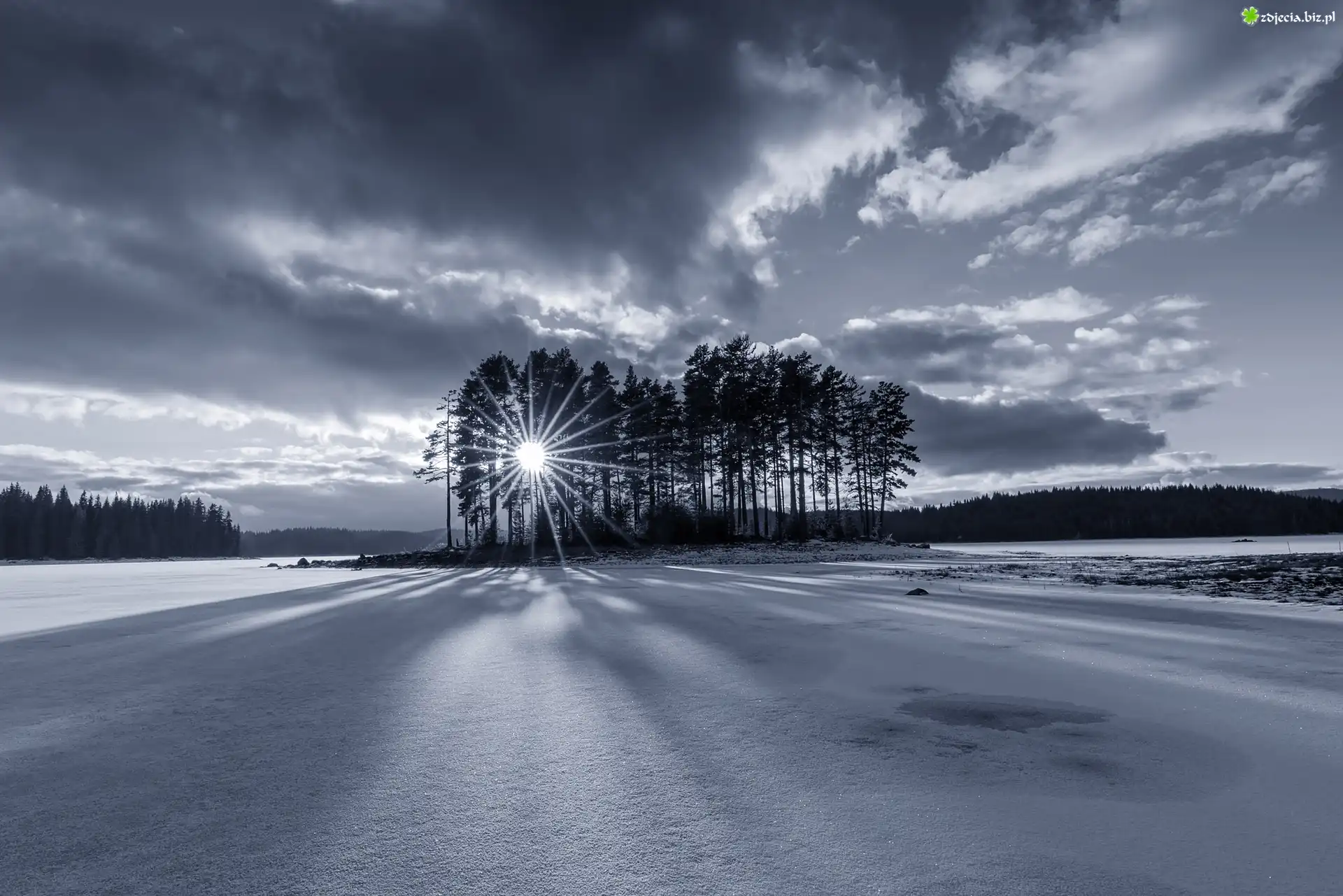 Zdjęcie, Zima, Promienie słońca, Drzewa, Chmury