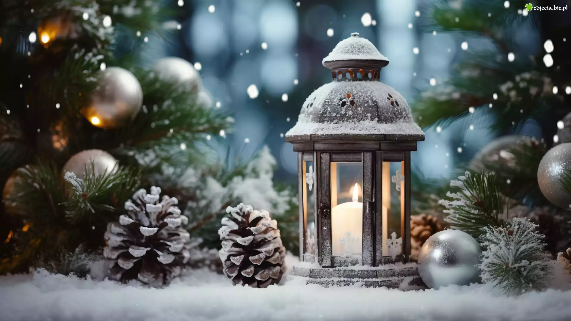 Zdjęcie Zima, Śnieg, Lampion, Świeca, Bombki, Szyszki, Gałązki, Boże Narodzenie