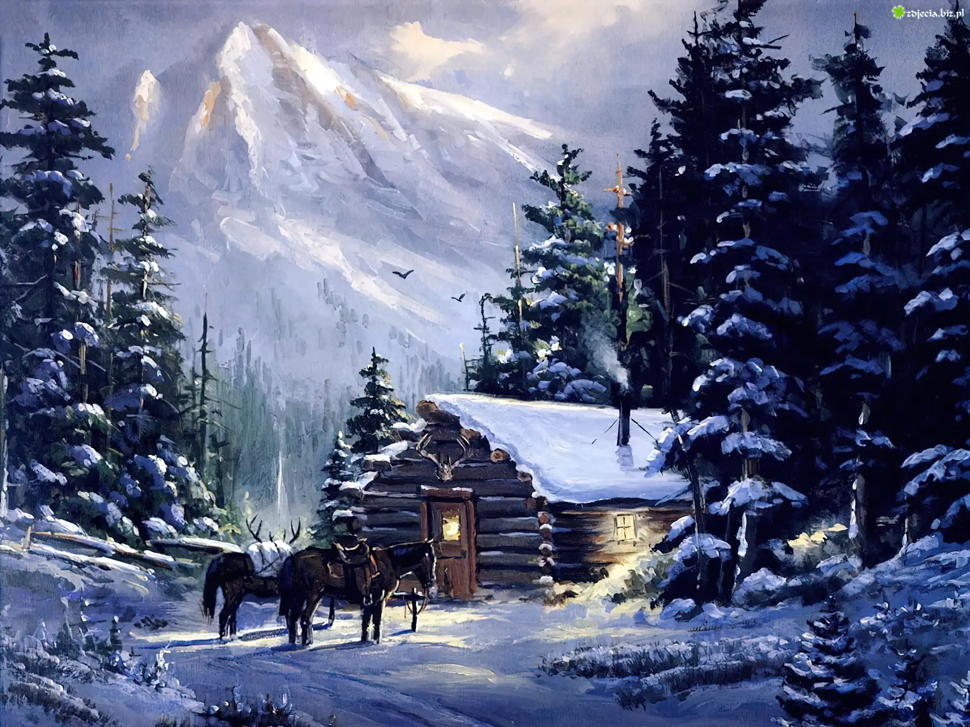 Zdjęcie Zima, Konie, Dom, Góry, Drzewa