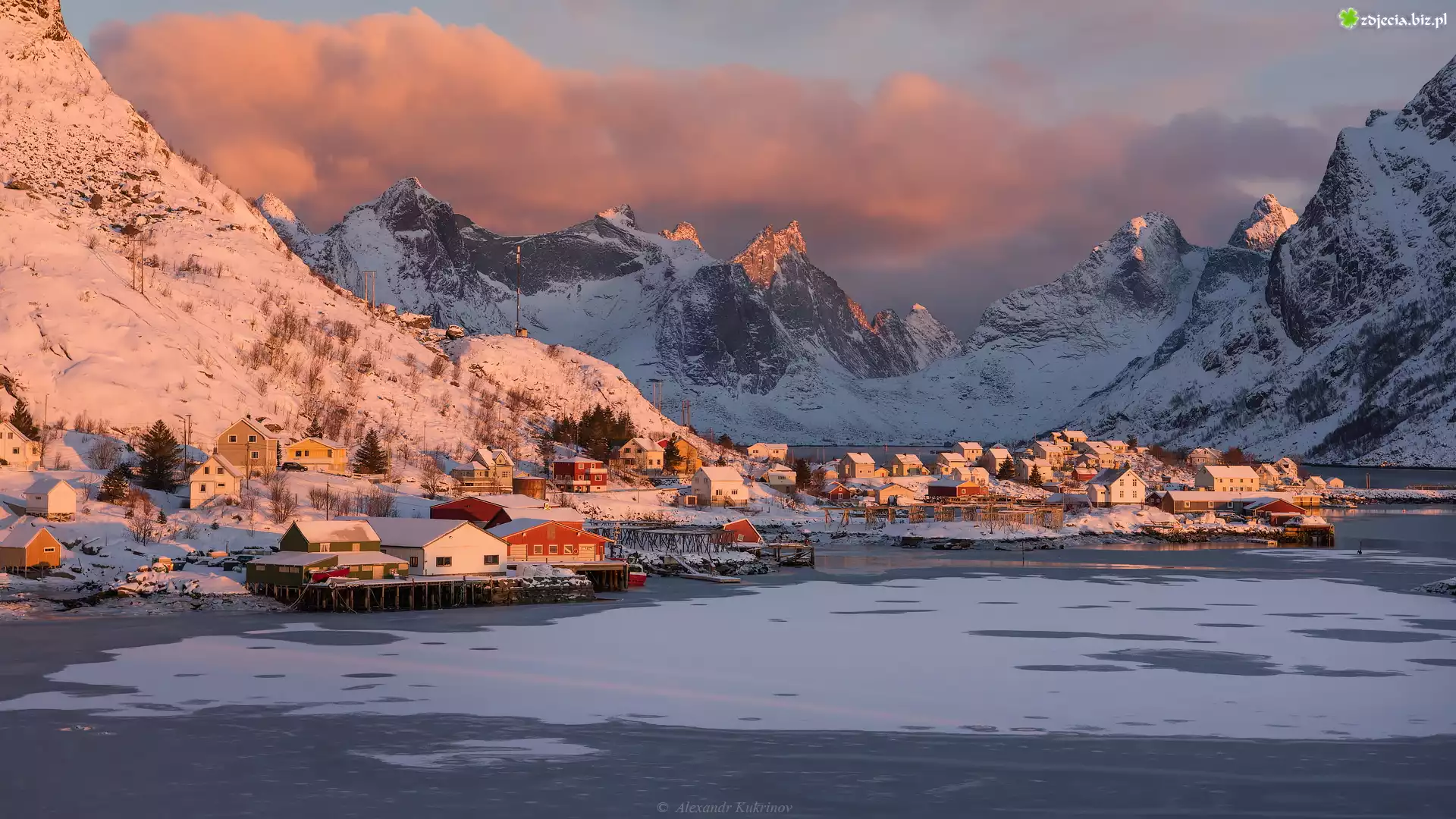 Zdjęcie, Góry, Zima, Wioska, Reine, Domy, Lofoty, Norwegia