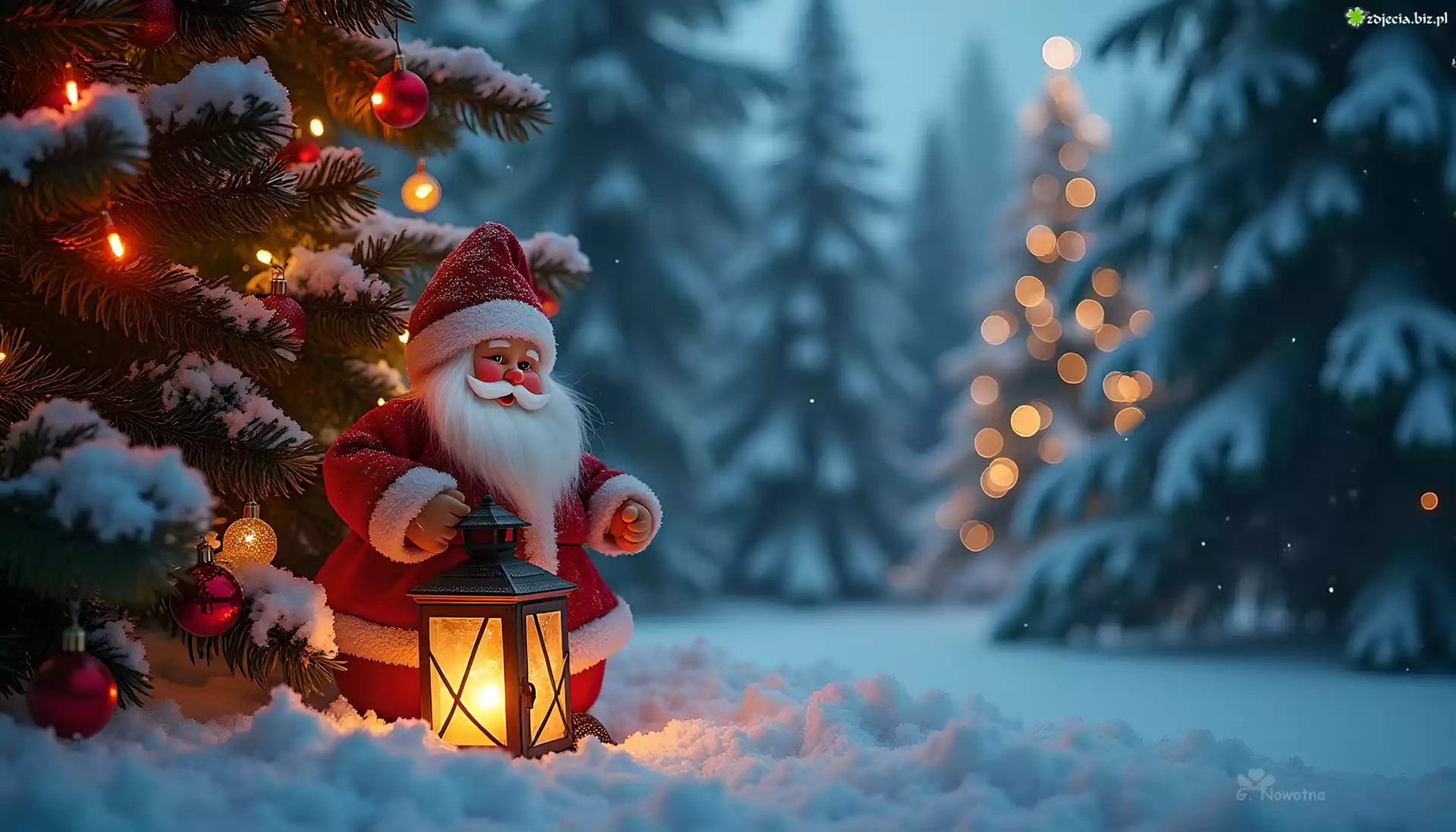 Zdjęcie Mikołaj, Choinka, Lampion, Zima, Śnieg, Grafika
