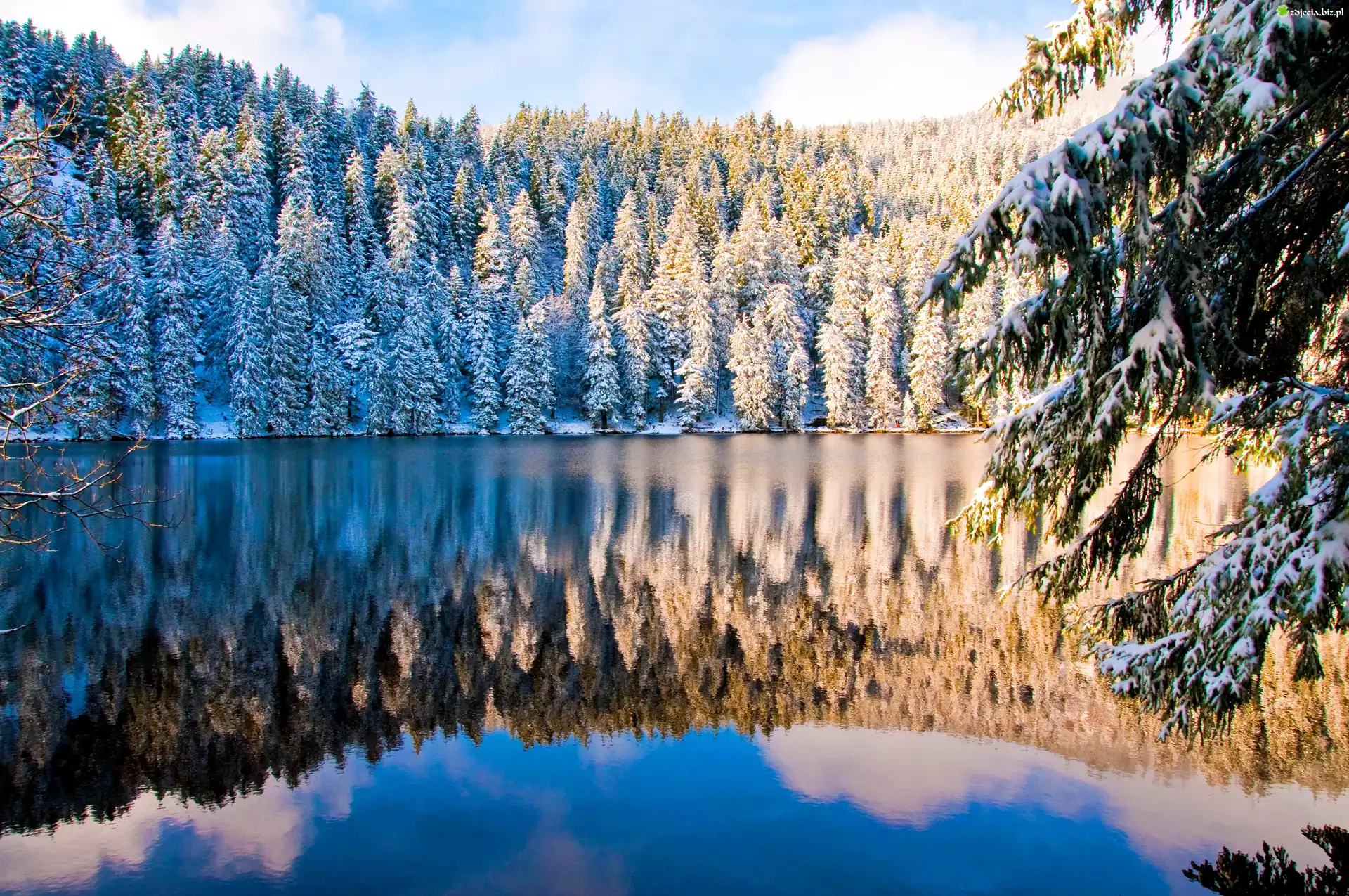 Zdjęcie, Zima, Lasy, Jezioro, Odbicie