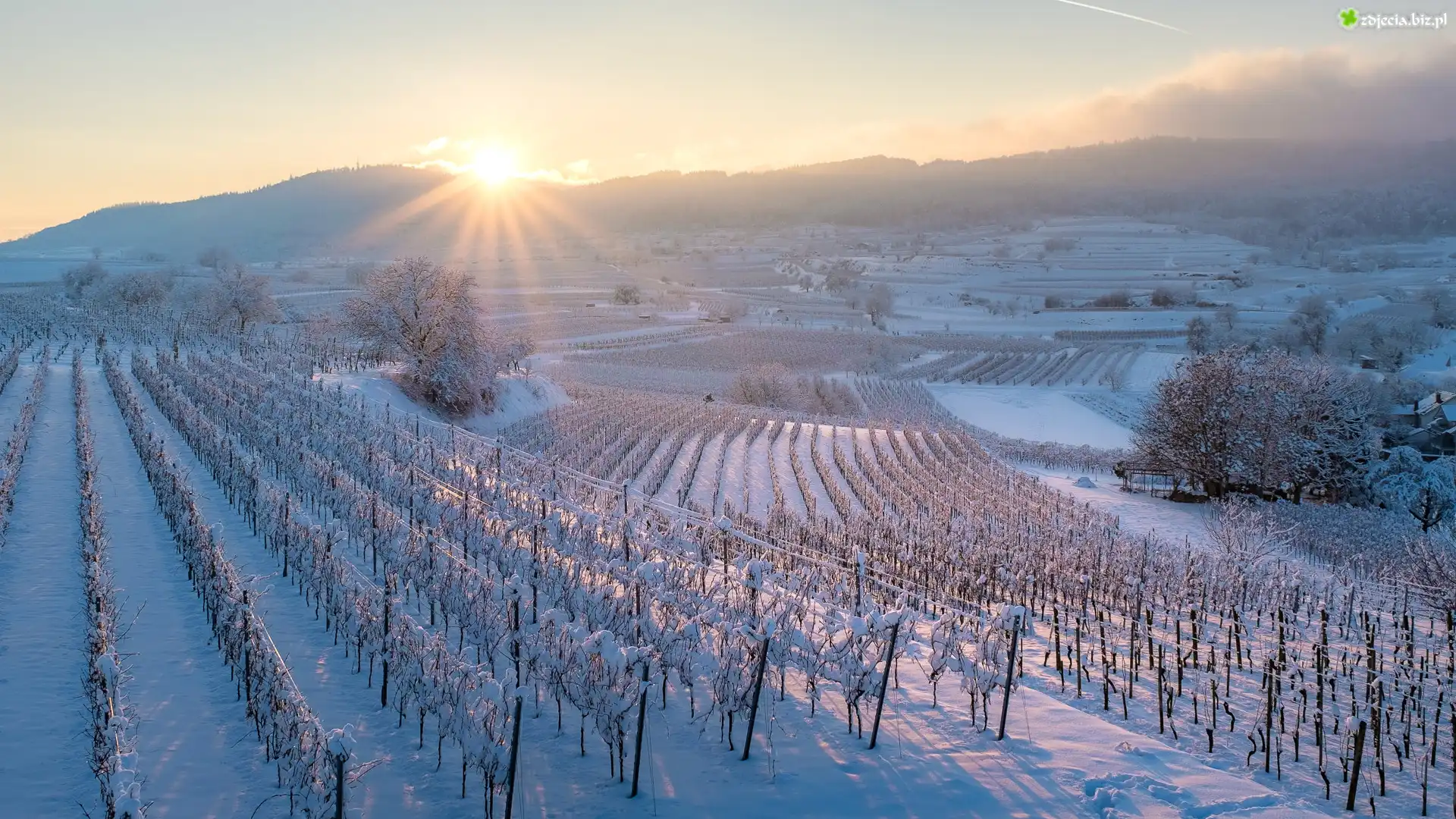 Zdjęcie Zima, Wzgórza, Góry, Kaiserstuhl, Zaśnieżone, Plantacje, Pola, Drzewa, Promienie słońca, Fryburg Bryzgowijski, Niemcy |