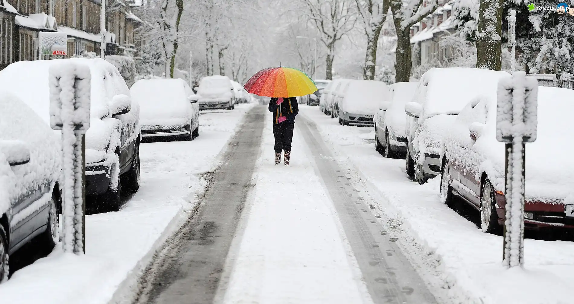 Zdjęcie Zima, Ulica, Samochody, Kobieta, Kolorowa, Parasolka