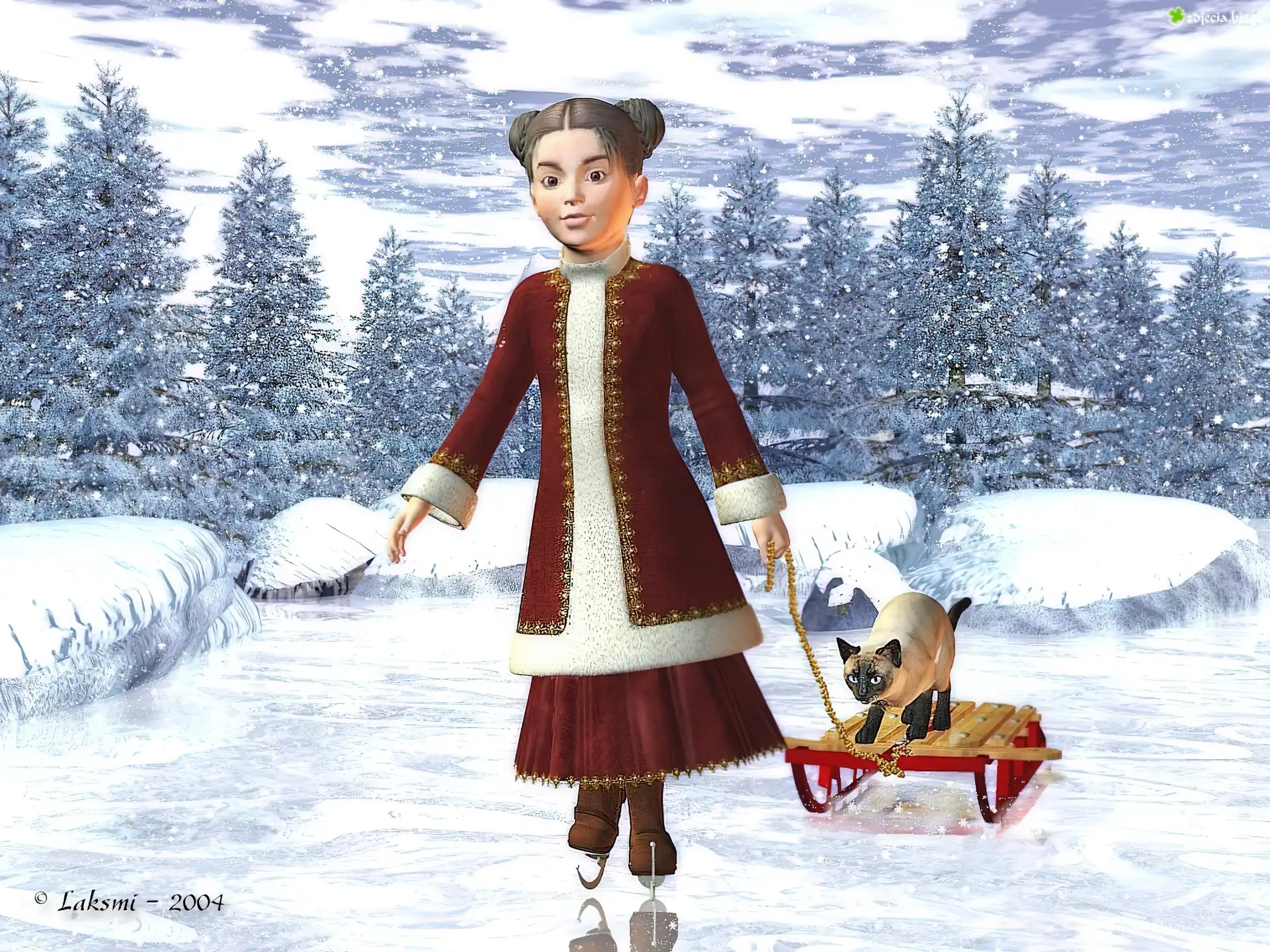 Zdjęcie Zima, Dziewczynka, Sanki, Kot, 3D