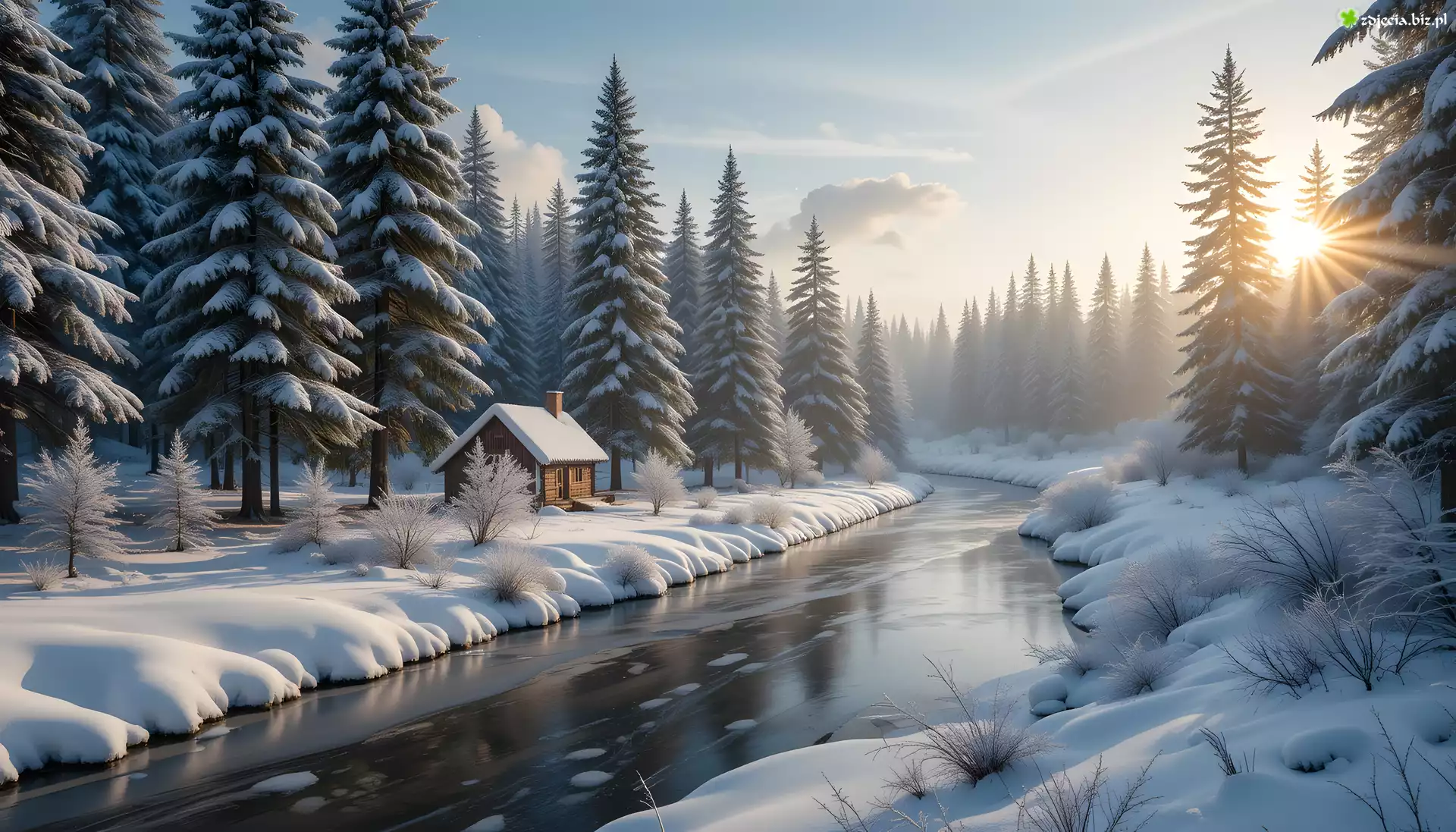 Zdjęcie Zima, Rzeka, Dom, Las, Ośnieżone, Drzewa, Krzewy, Promienie słońca