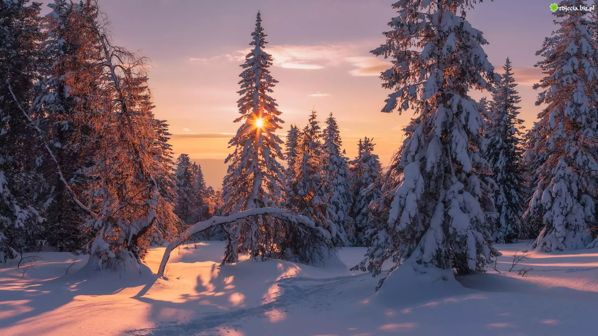 Zdjęcie Zima, Śnieg, Promienie słońca, Las, Świerki