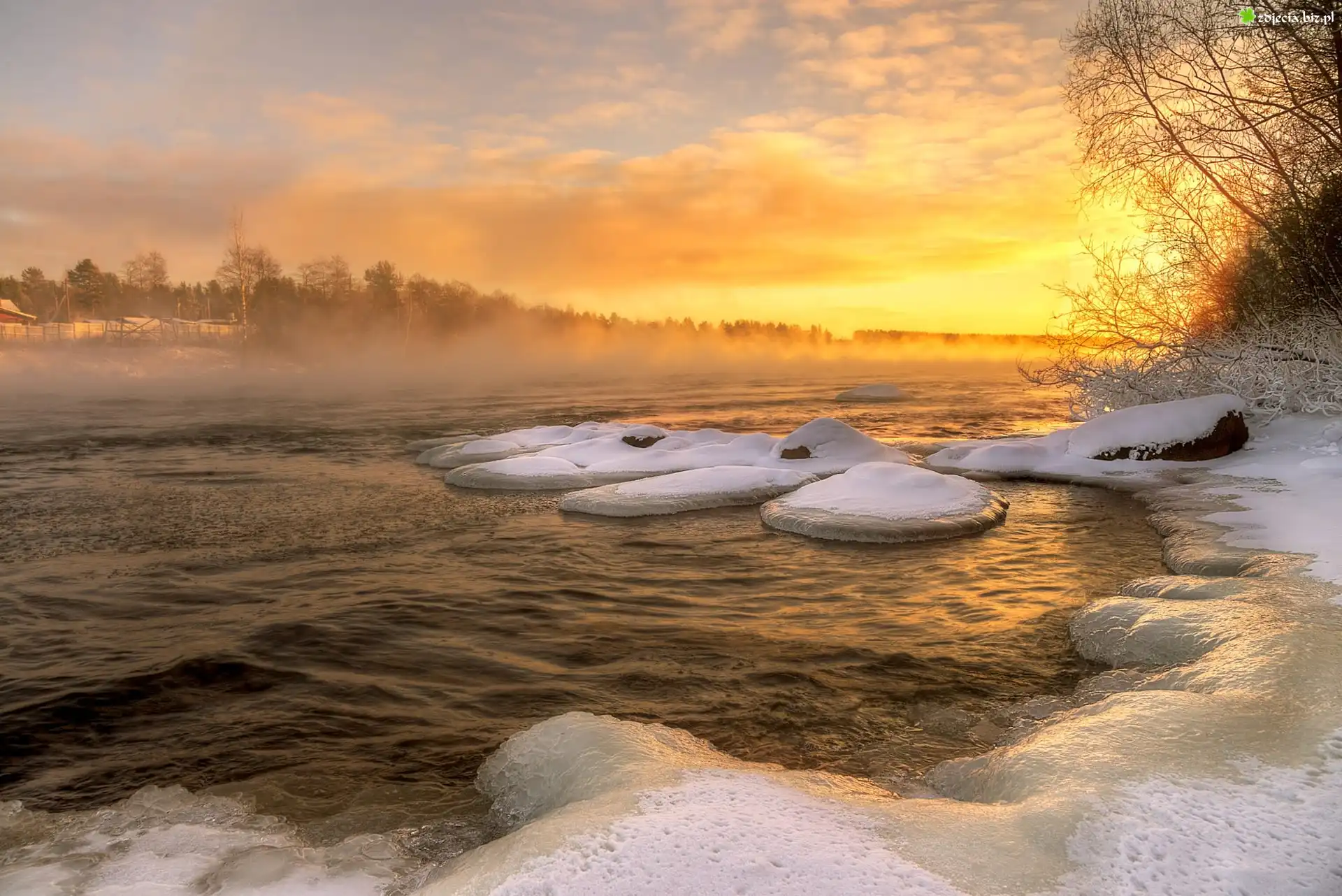 Zdjęcie Zima, Zachód słońca, Rzeka, Lód, Mgła