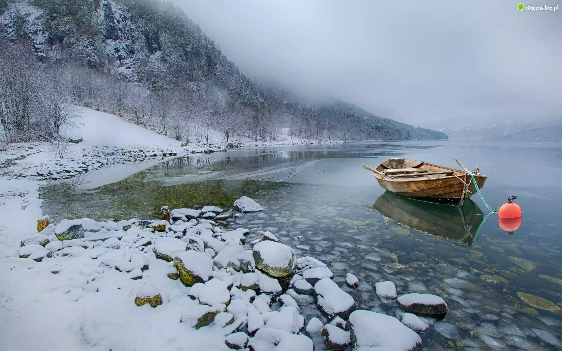 Zdjęcie Zima, Jezioro, Kamienie, Łódka, Mgła, Drzewa