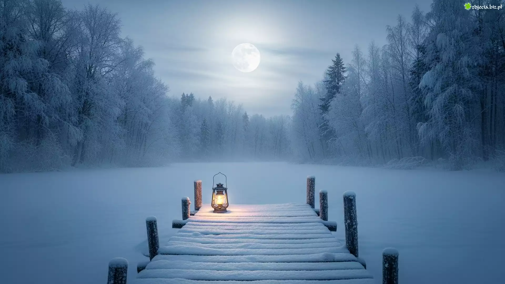 Zdjęcie Zima, Pomost, Latarnia, Zaśnieżone, Jezioro, Ośnieżone, Drzewa, Śnieg, Mgła, Księżyc