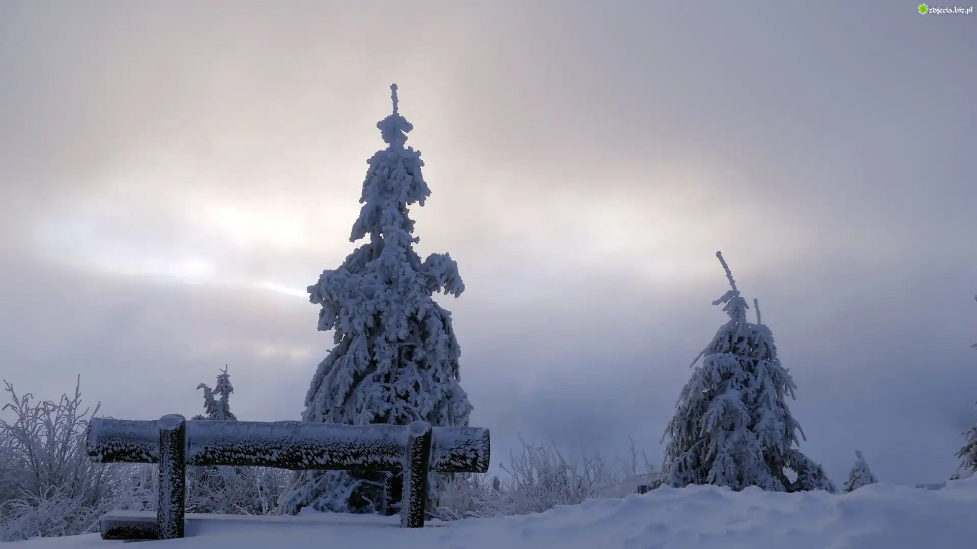 Zdjęcie Zima, Świerki, Mgła, Ławka