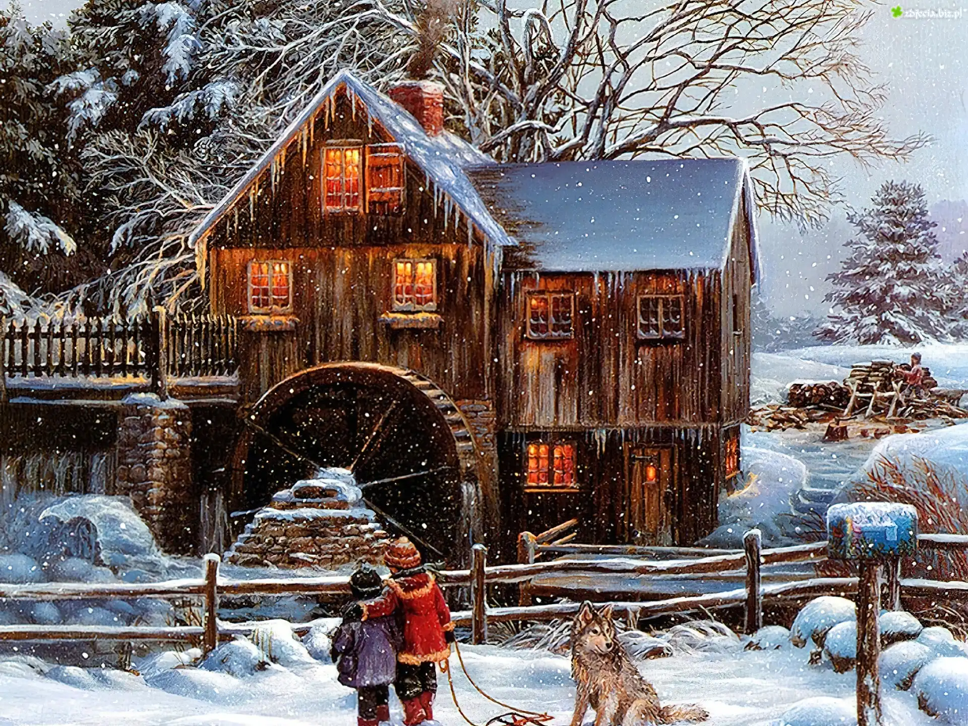Zdjęcie Zima, Dzieci, Drewniany, Młyn Wodny