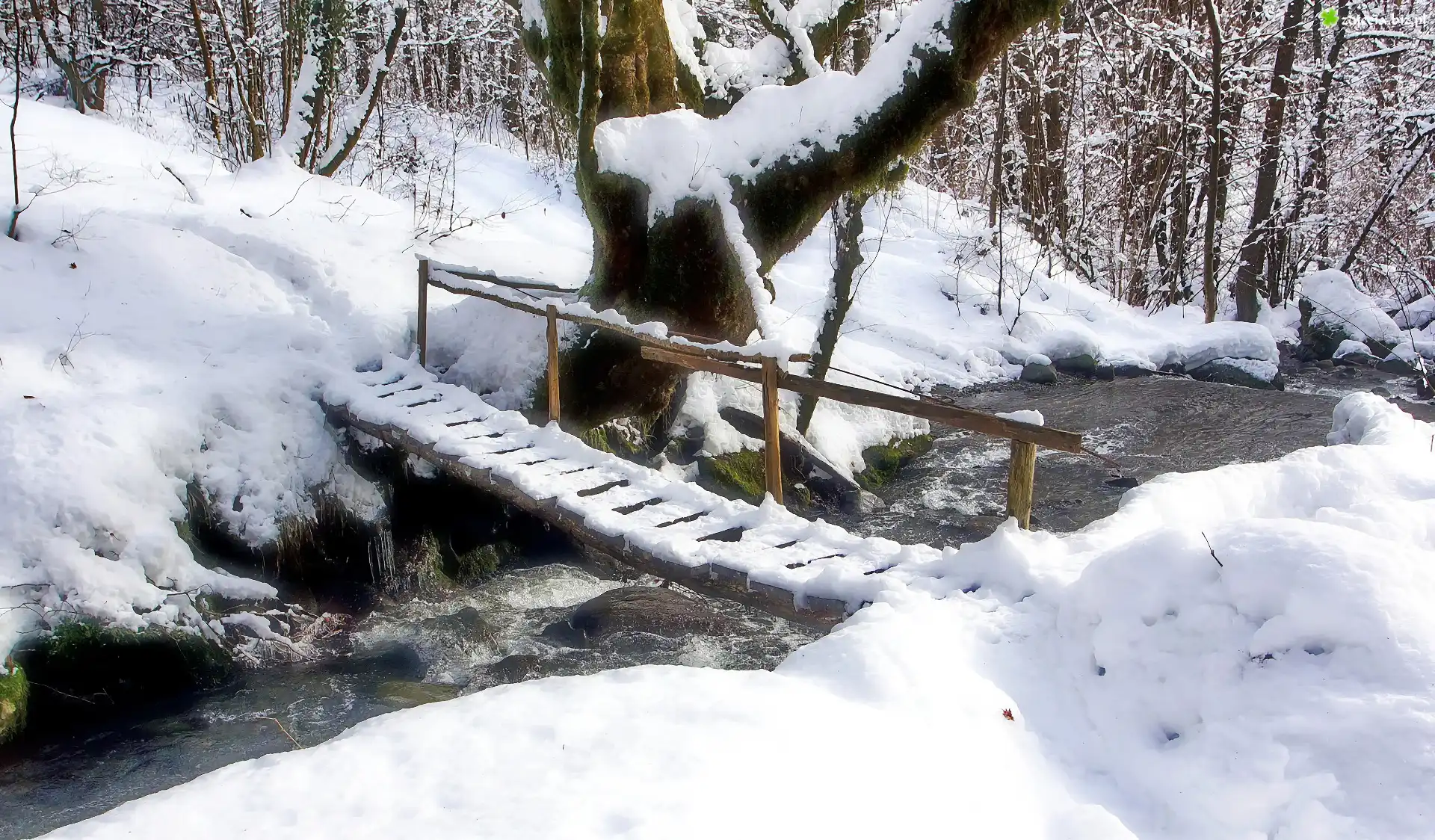 Zdjęcie Zima, Las, Drzewa, Mostek, Rzeka
