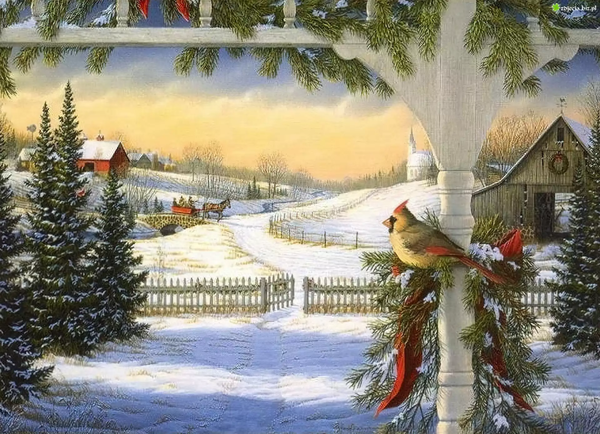 Zdjęcie Zima, Widoczek, Ptaki, Boże, Narodzenie, Malarstwo