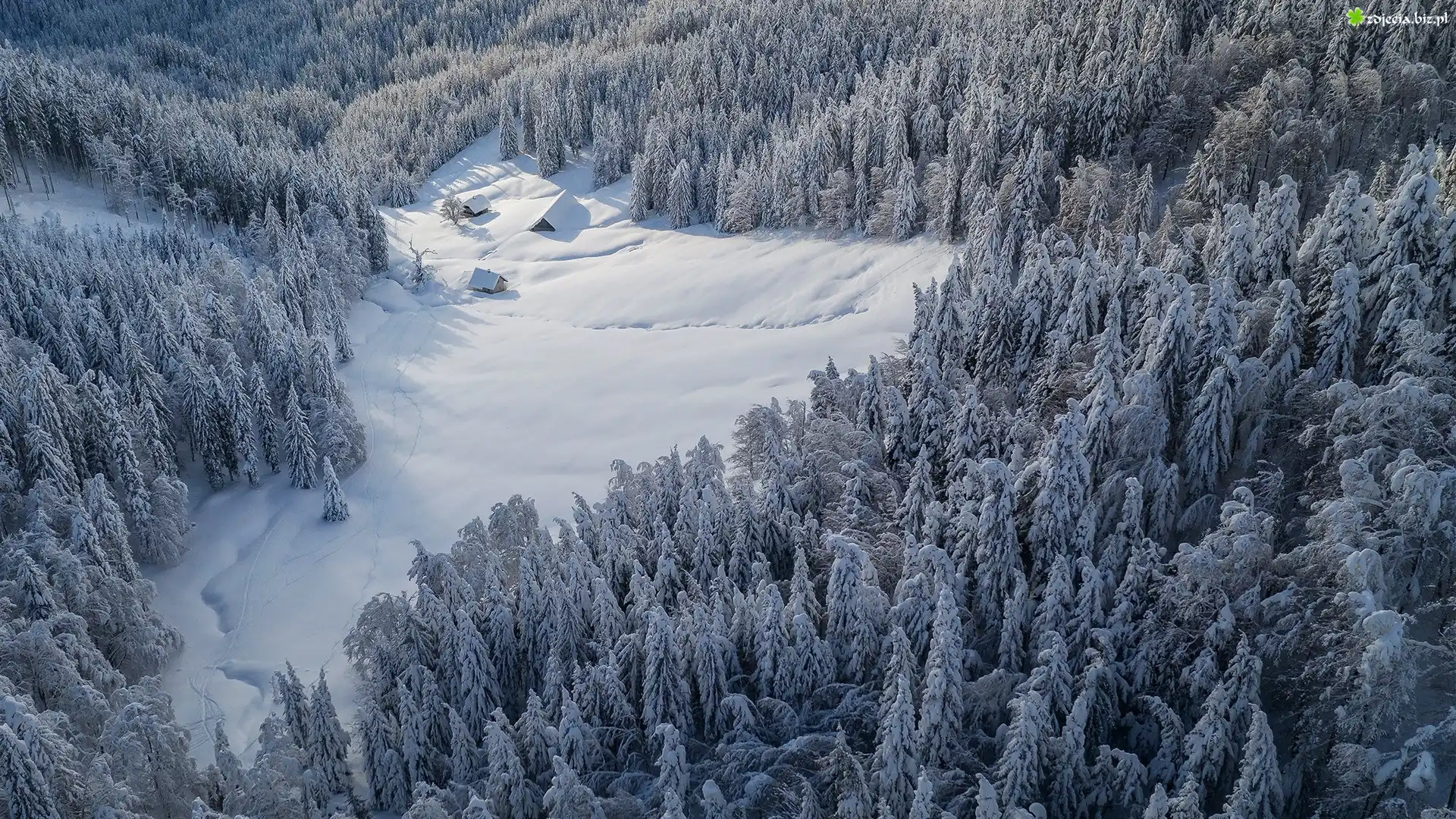 Zdjęcie Zima, Drzewa, Las, Polana, Śnieg, Domy