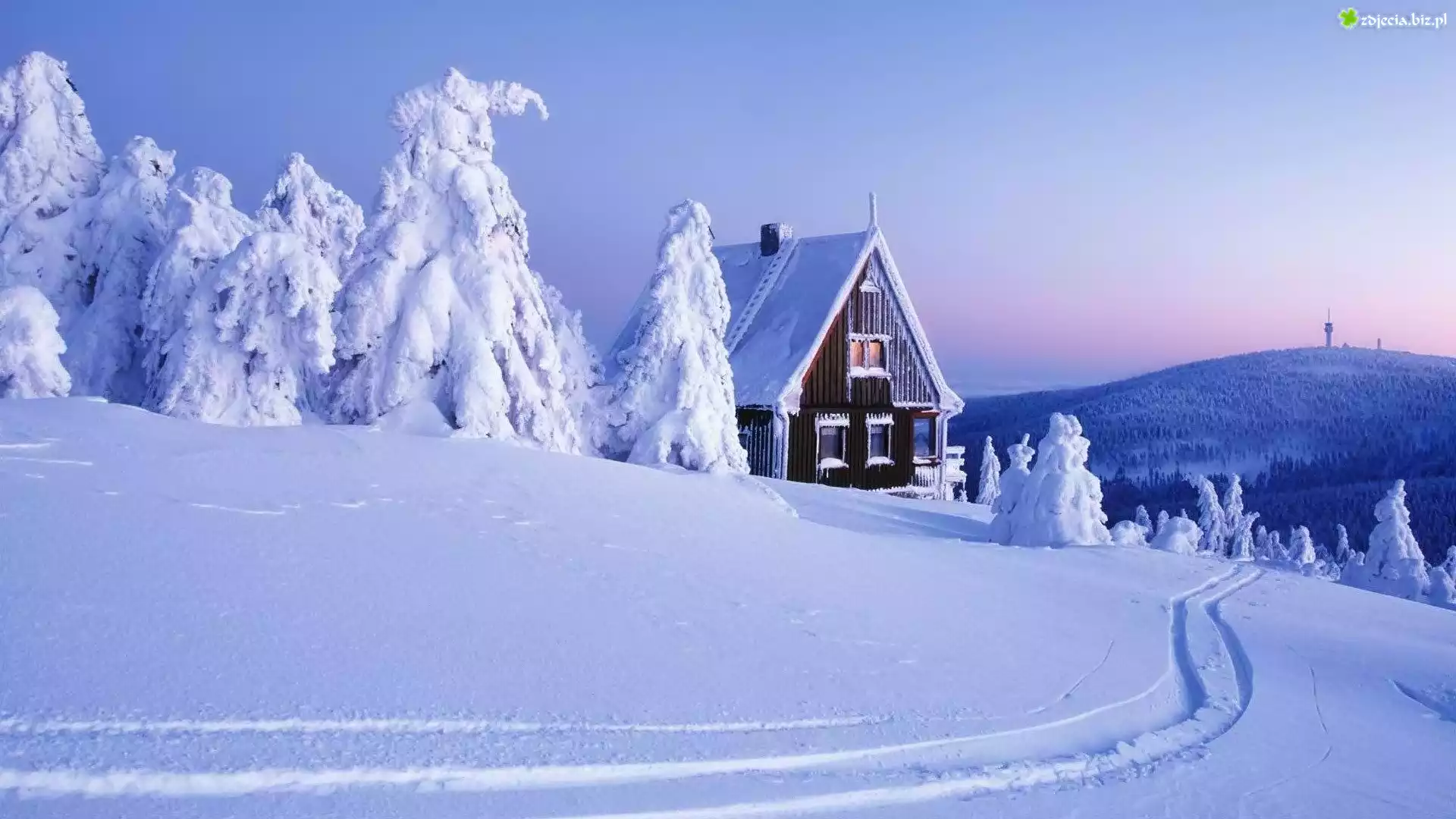 Zdjęcie Zima, Domek, Ośnieżone, Drzewa
