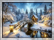 Zdjęcie Zima, Rzeka, Most, Lampa, Dom, Las, Ośnieżone, Drzewa, Śnieg