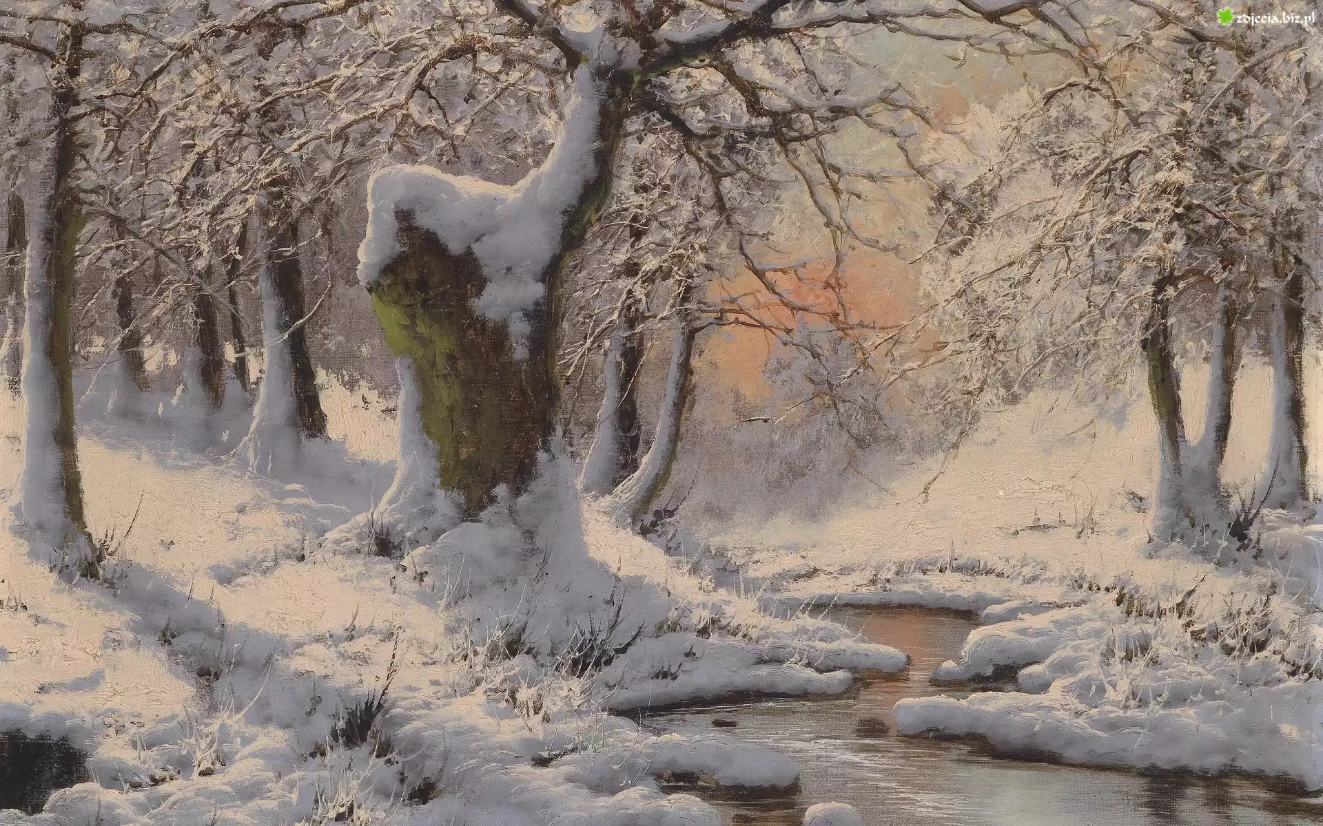 Zdjęcie Obraz, Reprodukcja, Zima, Las, Ośnieżone, Drzewa, Rzeka, Zachód słońca, Laszlo Neogrady