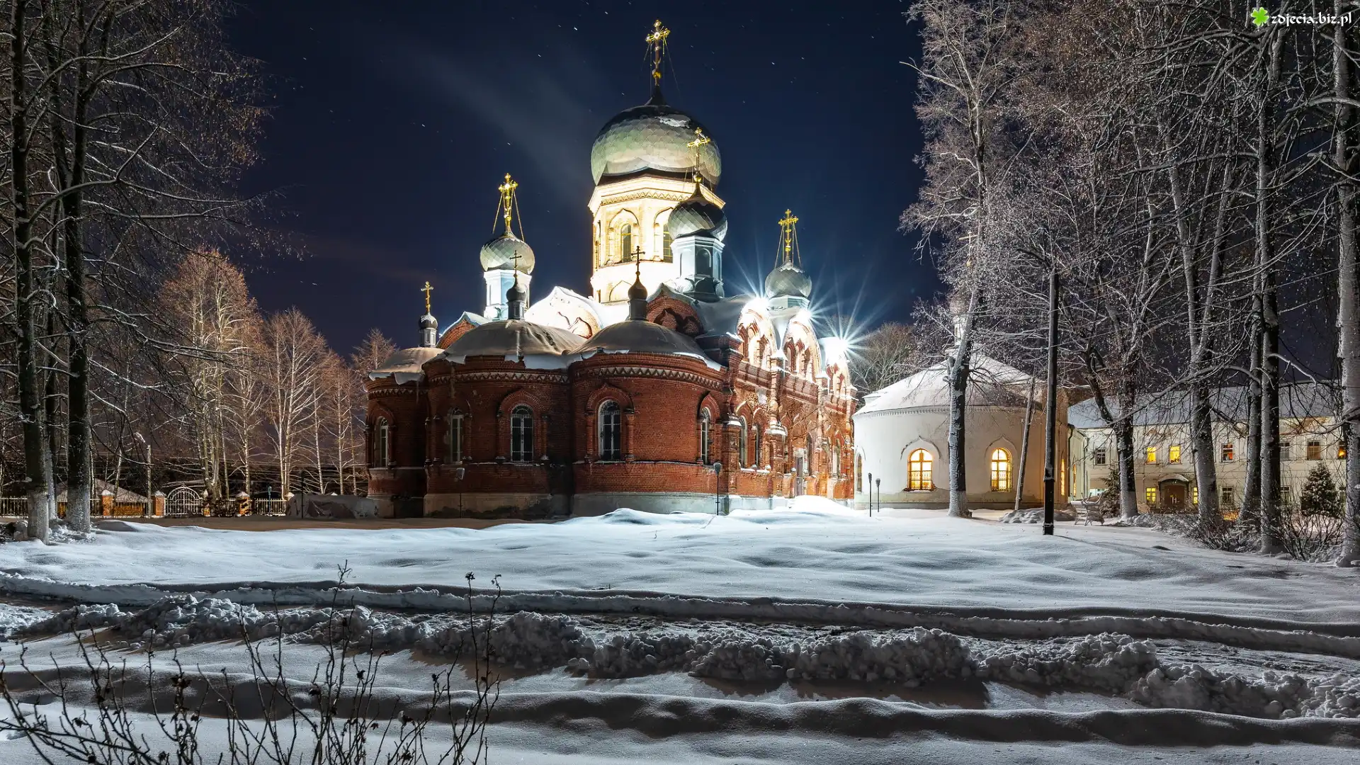 Zdjęcie Zima, Noc, Drzewa, Oświetlona, Cerkiew