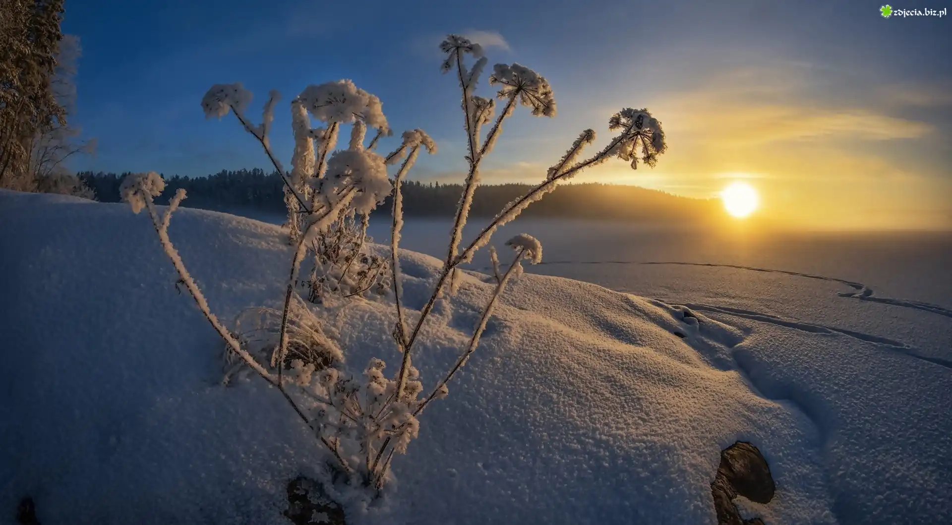 Zdjęcie Zima, Wschód słońca, Oszronione, Rośliny
