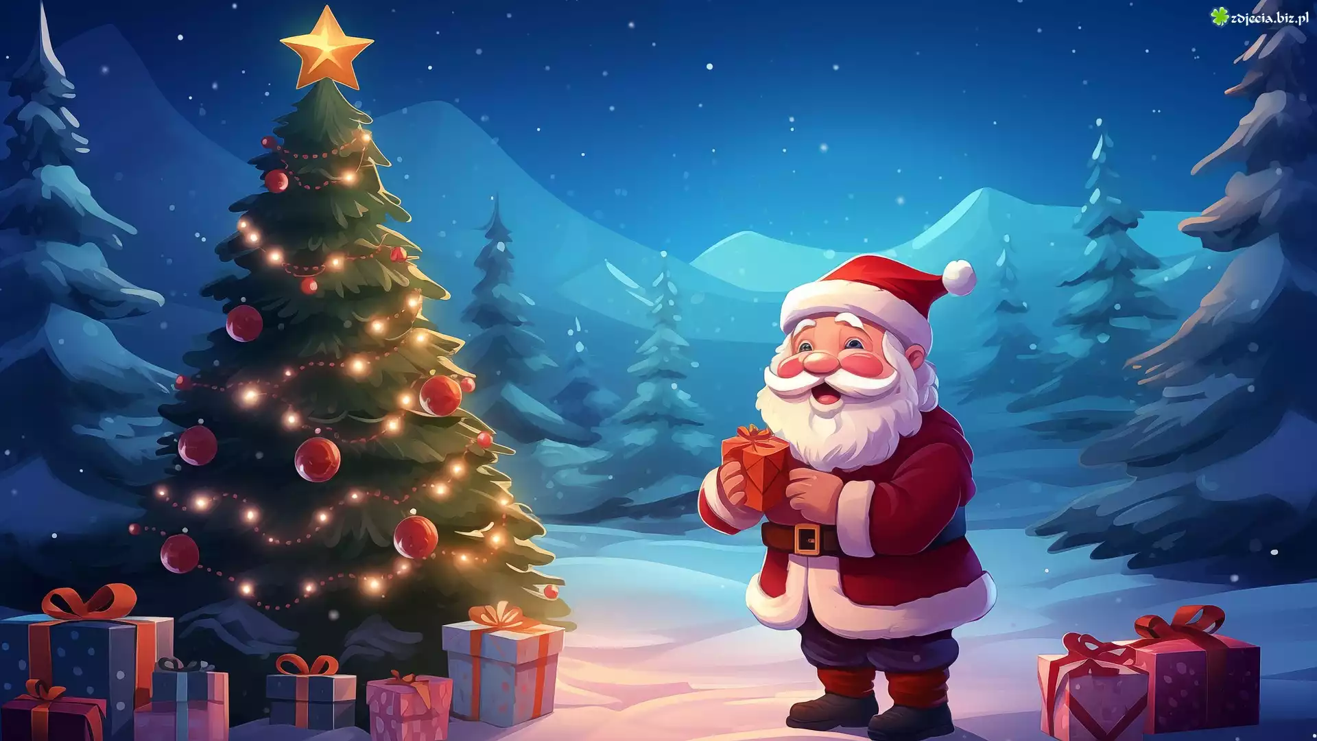 Zdjęcie Zima, Góry, Śnieg, Boże Narodzenie, Choinki, Bombki, Światełka, Prezenty, Grafika