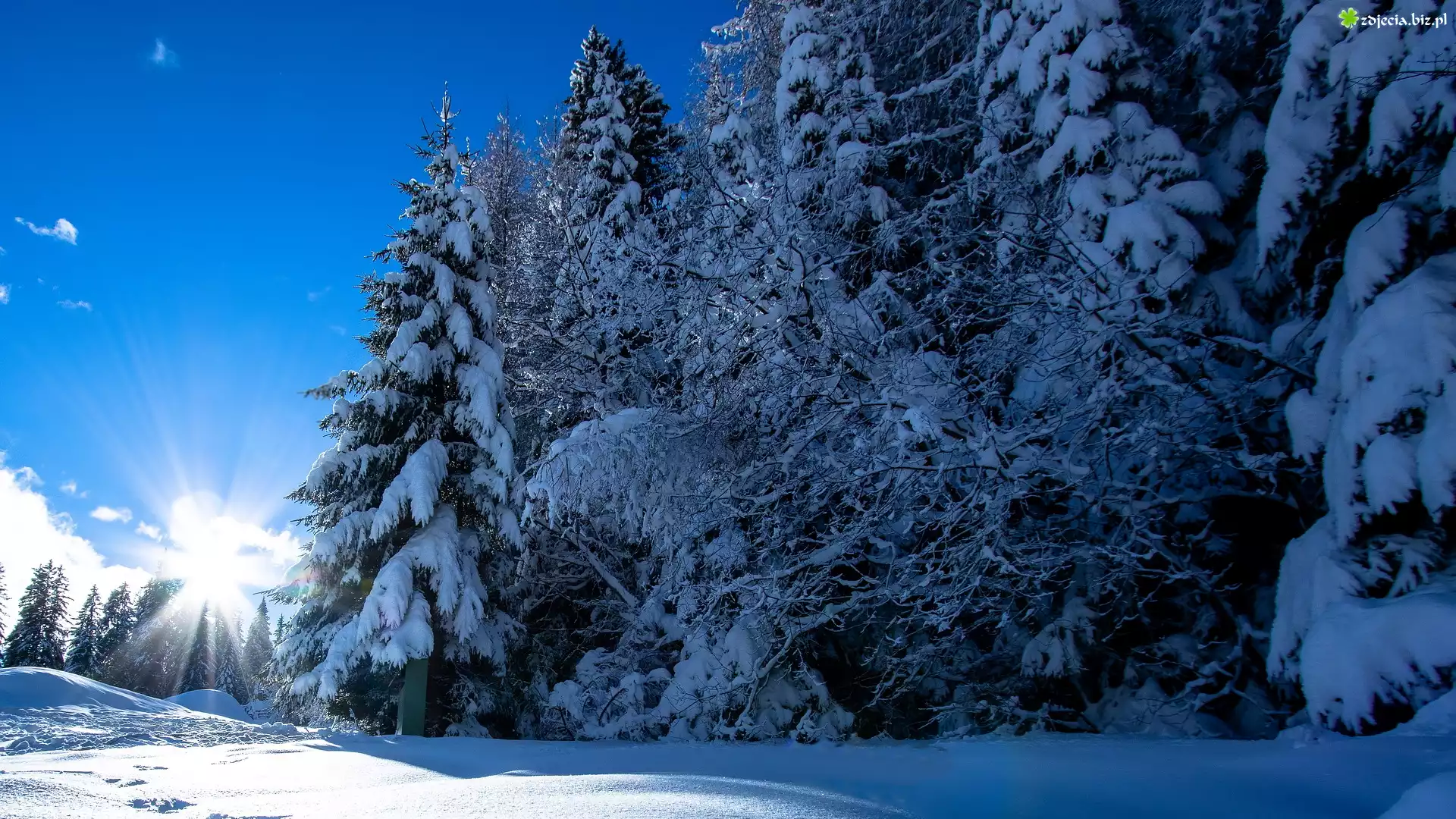 Zdjęcie Zima, Śnieg, Drzewa, Las, Promienie słońca